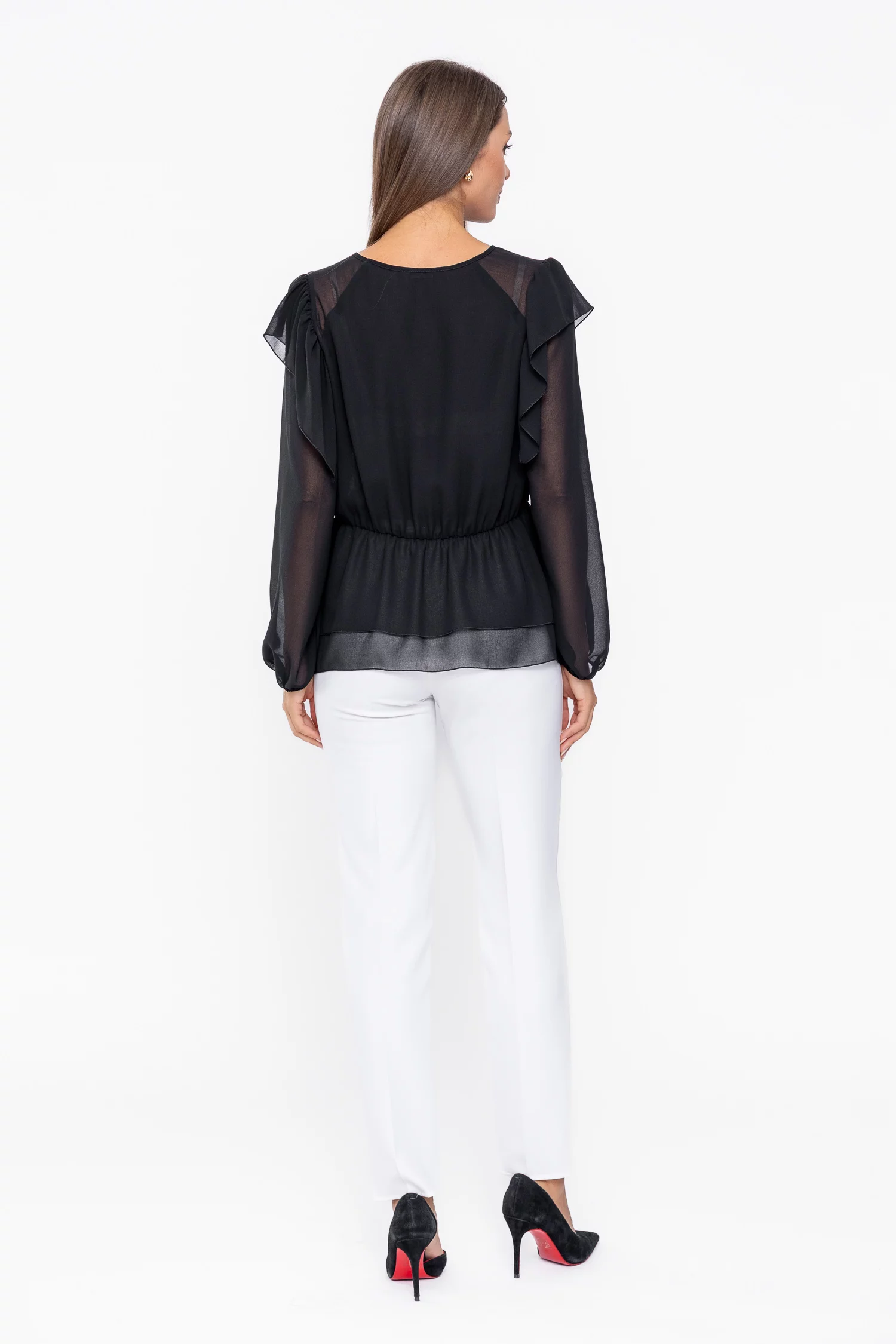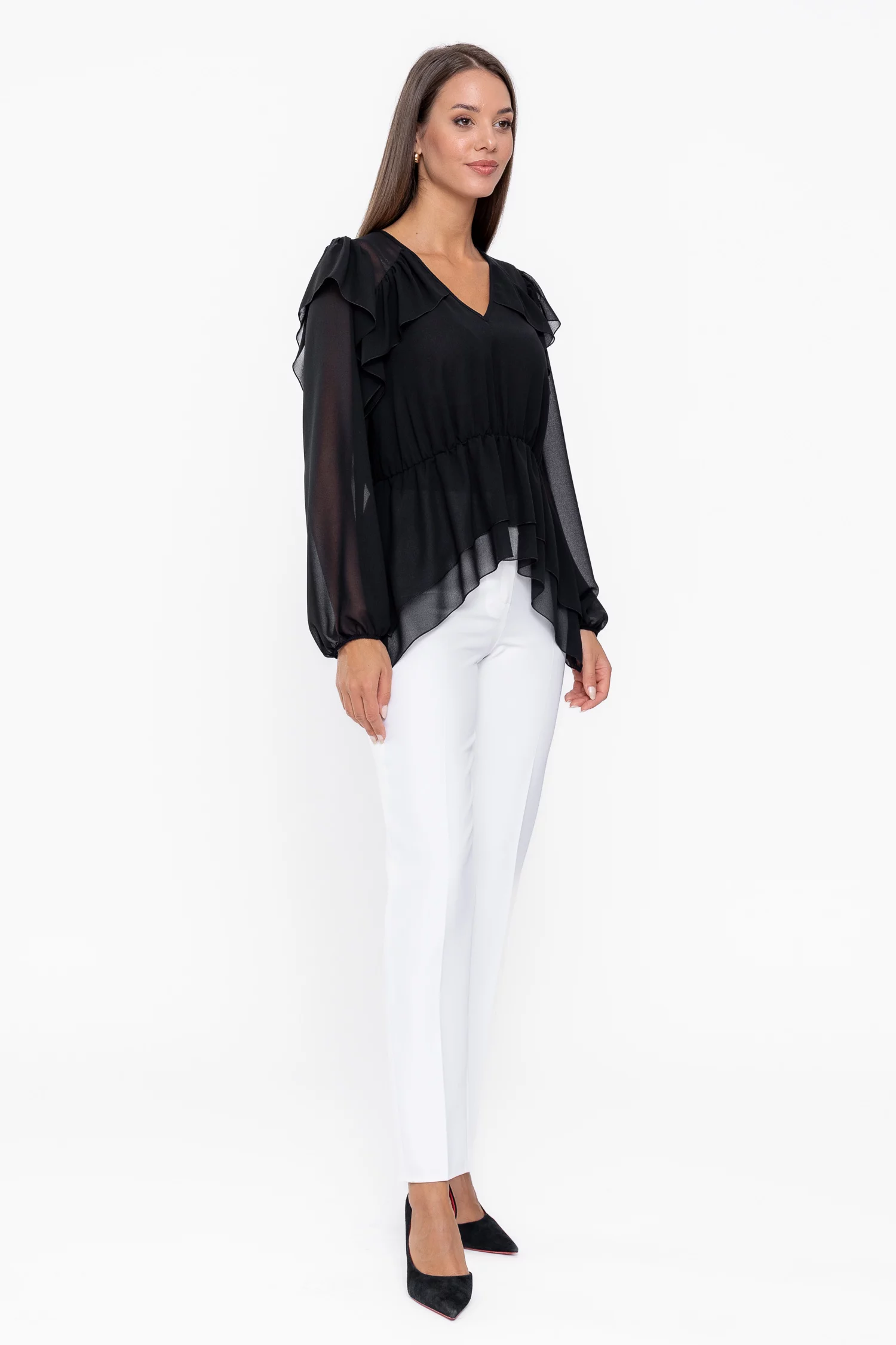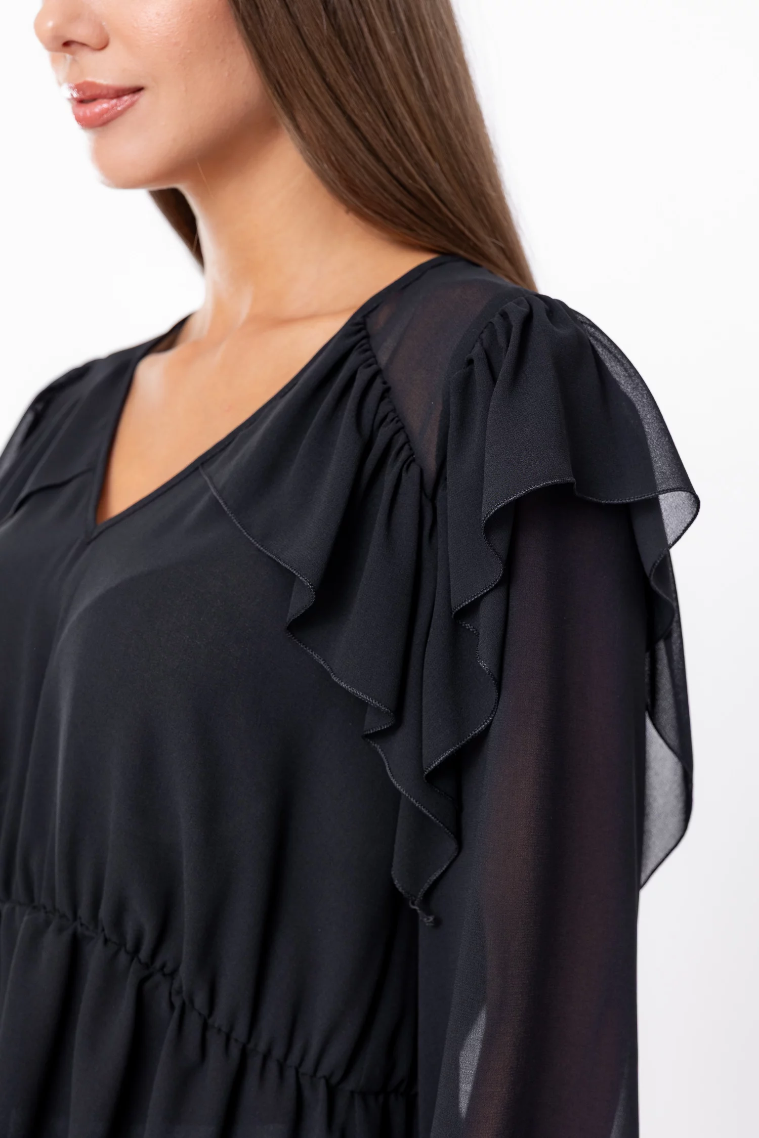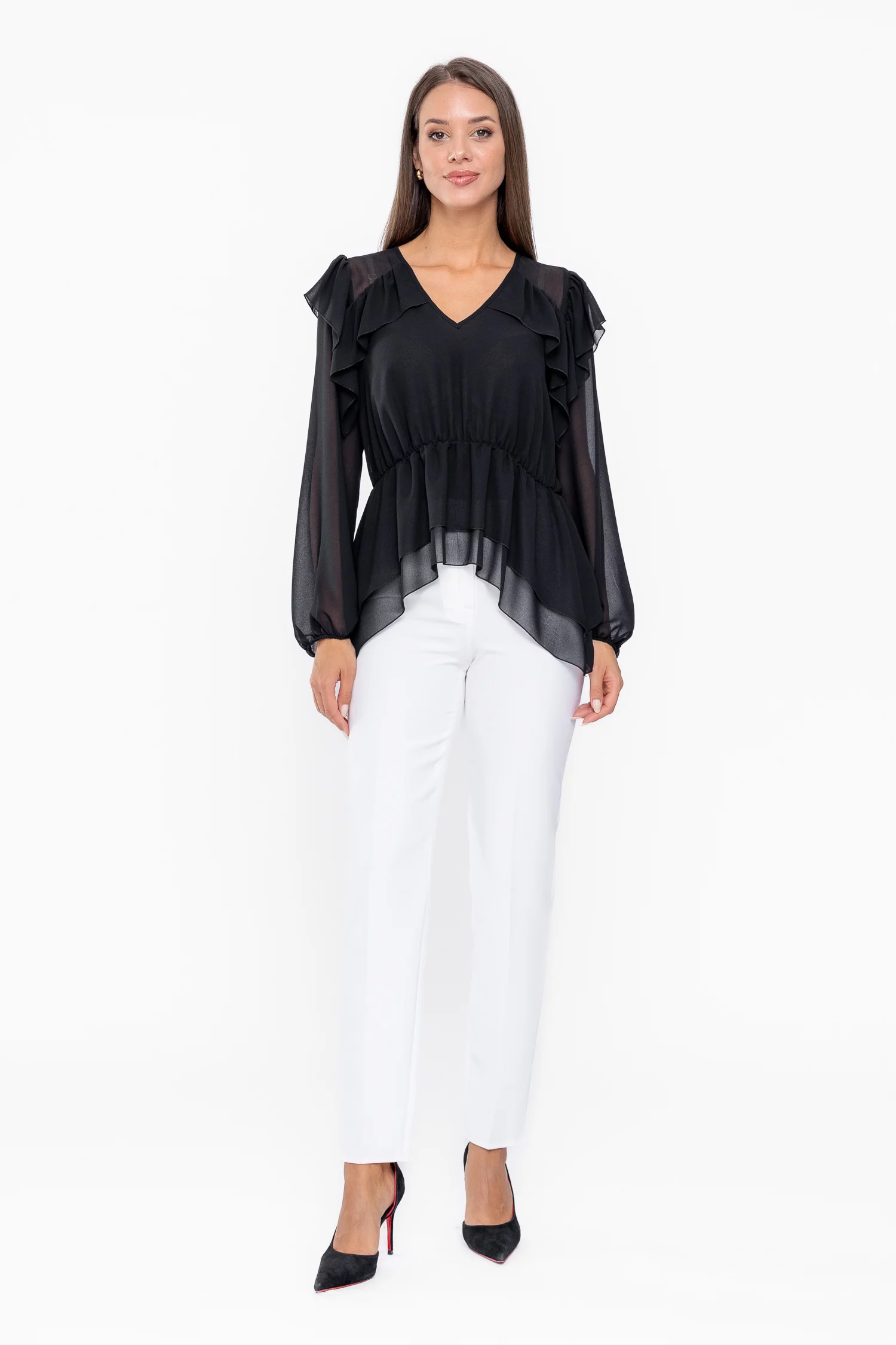 Bluza din voal cu decolteu în V este o piesă feminină și elegantă, ideală pentru ținute casual sau office. Are mâneci lungi cu manșete elastice, talie elastică ce evidențiază silueta și volane decorative care adaugă un plus de rafinament și fluiditate, transformând bluza într-un articol versatil și stilat pentru garderoba ta.