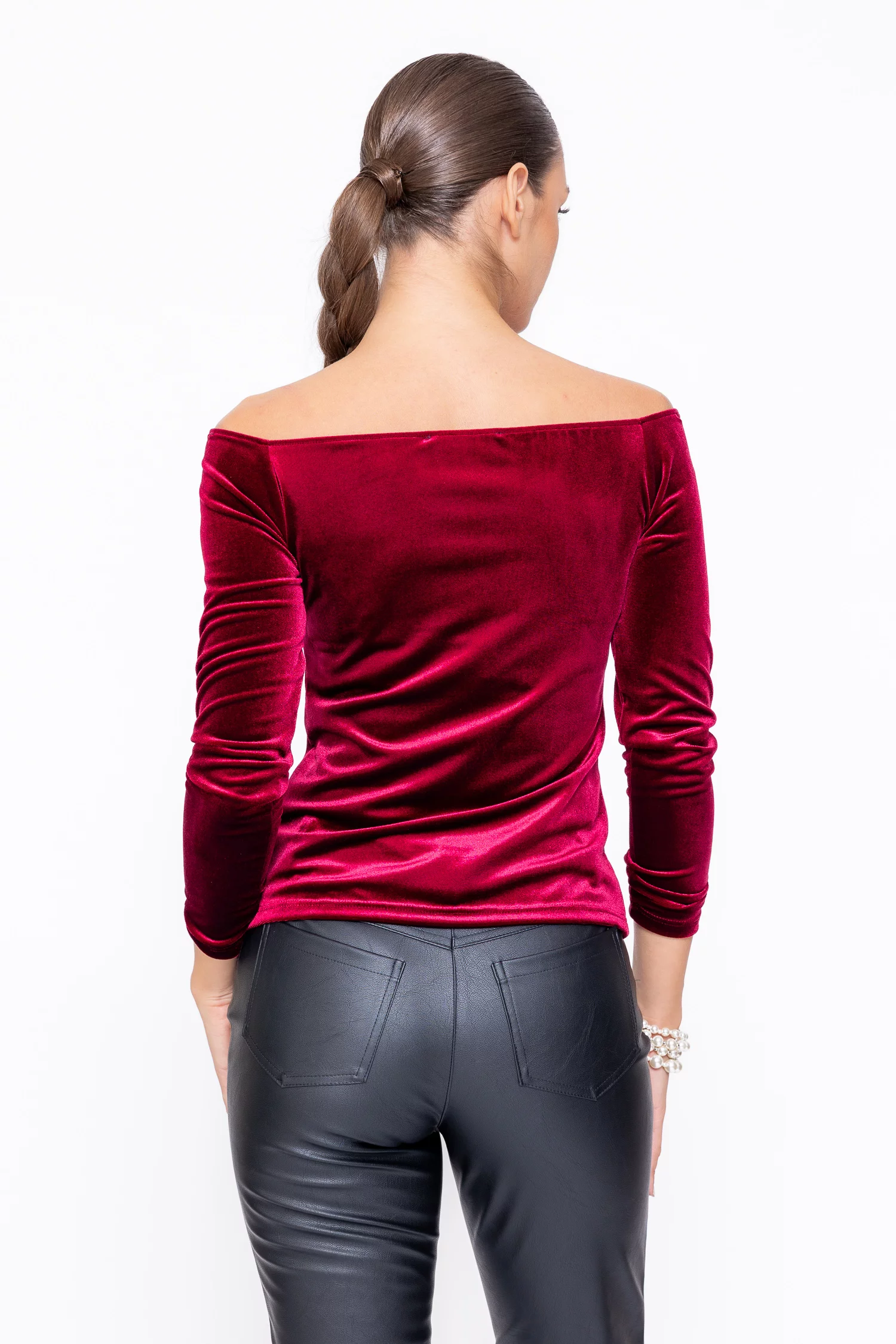 Bluză Caramel elegantă catifea burgundy cu accesoriu perlă B4542