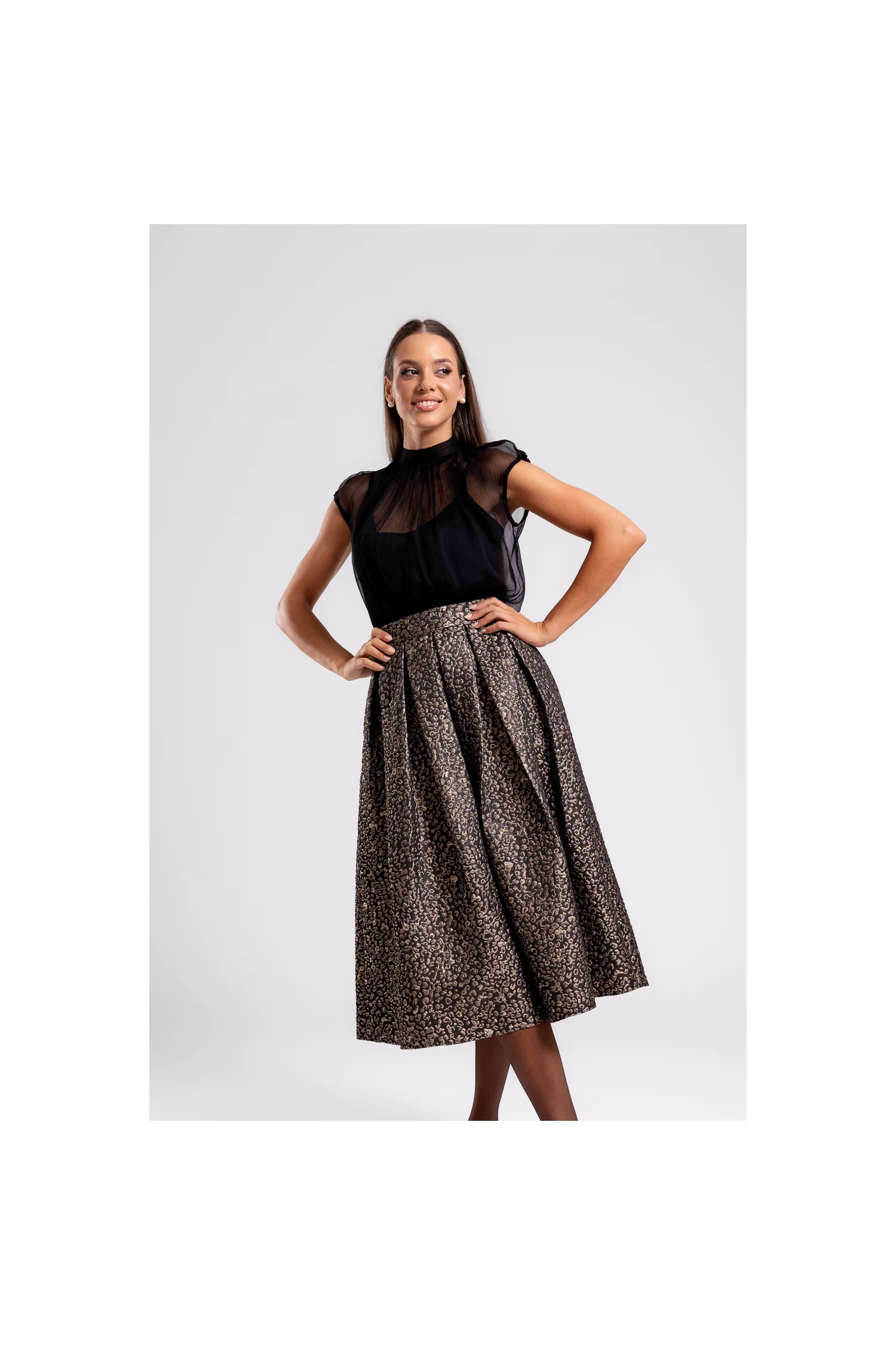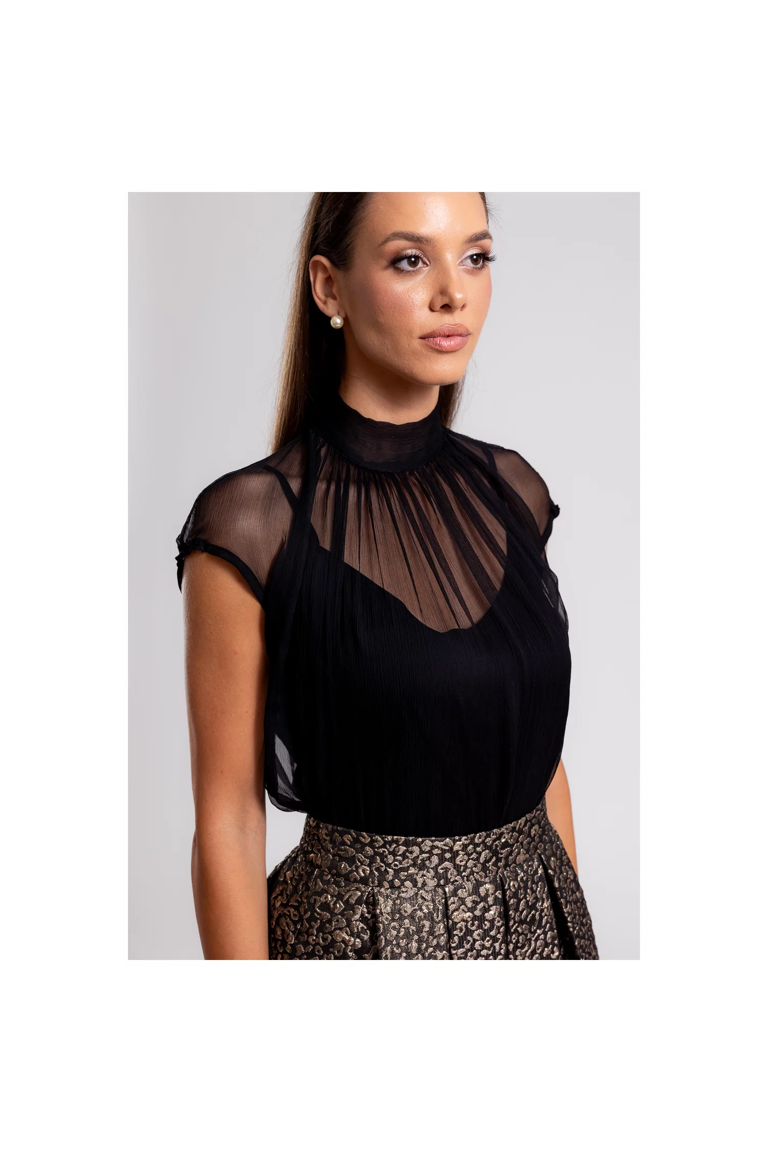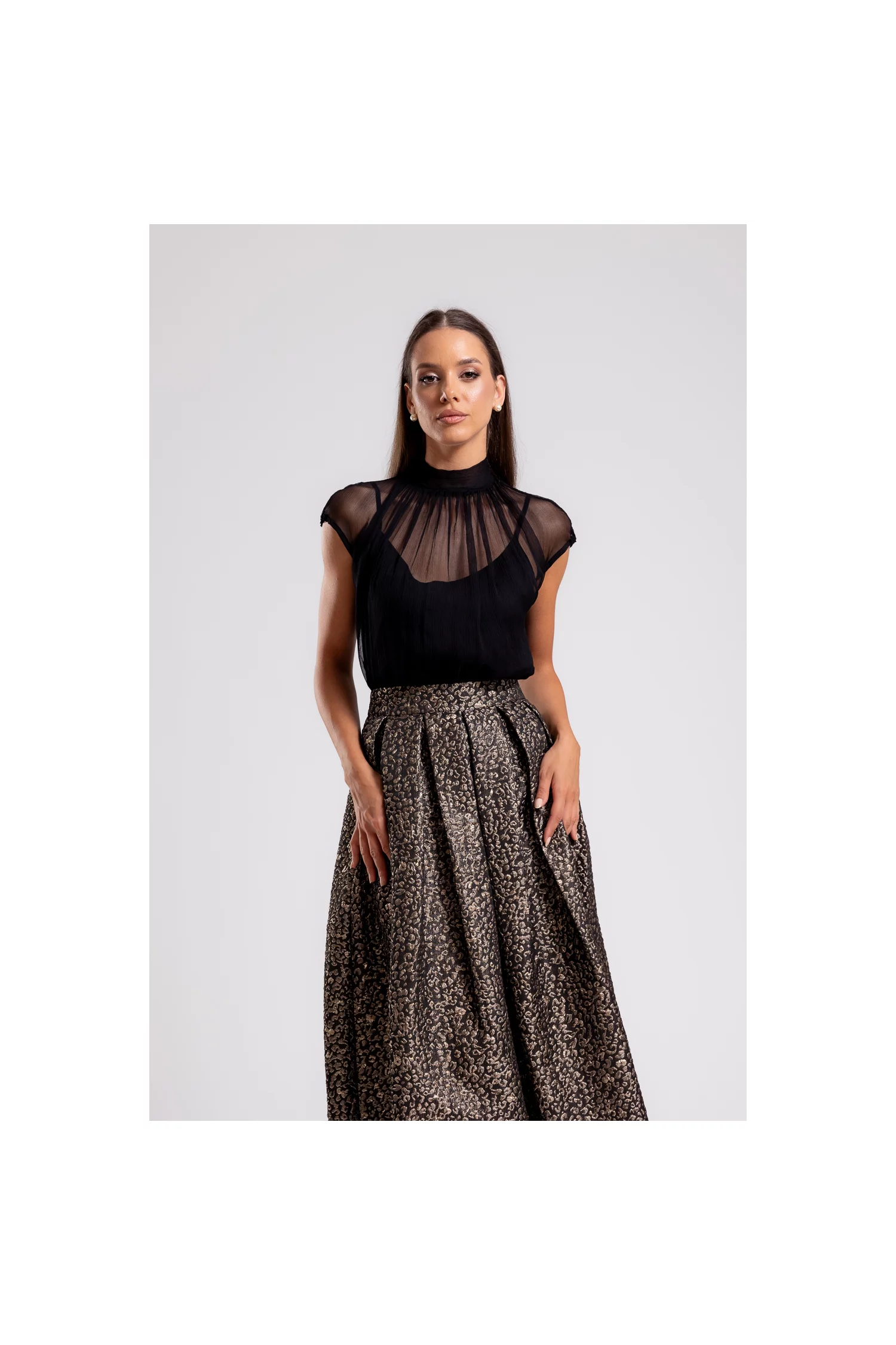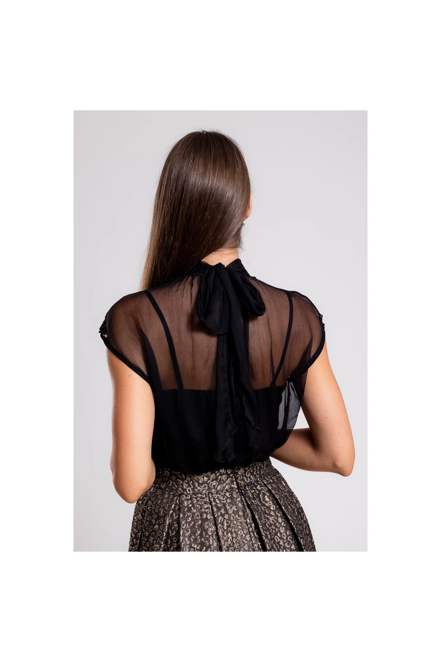 Această bluză elegantă, confecționată din mătase naturală de înaltă calitate, este alegerea perfectă pentru un look sofisticat și feminin. Decolteul rotund, amplasat delicat pe gât, este completat de un detaliu chic la spate, unde bluza se leagă într-o fundă elegantă, adăugând un plus de farmec și originalitate. Mânecile scurte, cu umeri căzuți, oferă un aspect lejer și modern, menținând în același timp eleganța clasică a piesei. Bluză Caramel Collection vine cu o căptușeală tip maiou detașabilă, confecționată din vâscoză, asigurând confort și acoperire discretă.