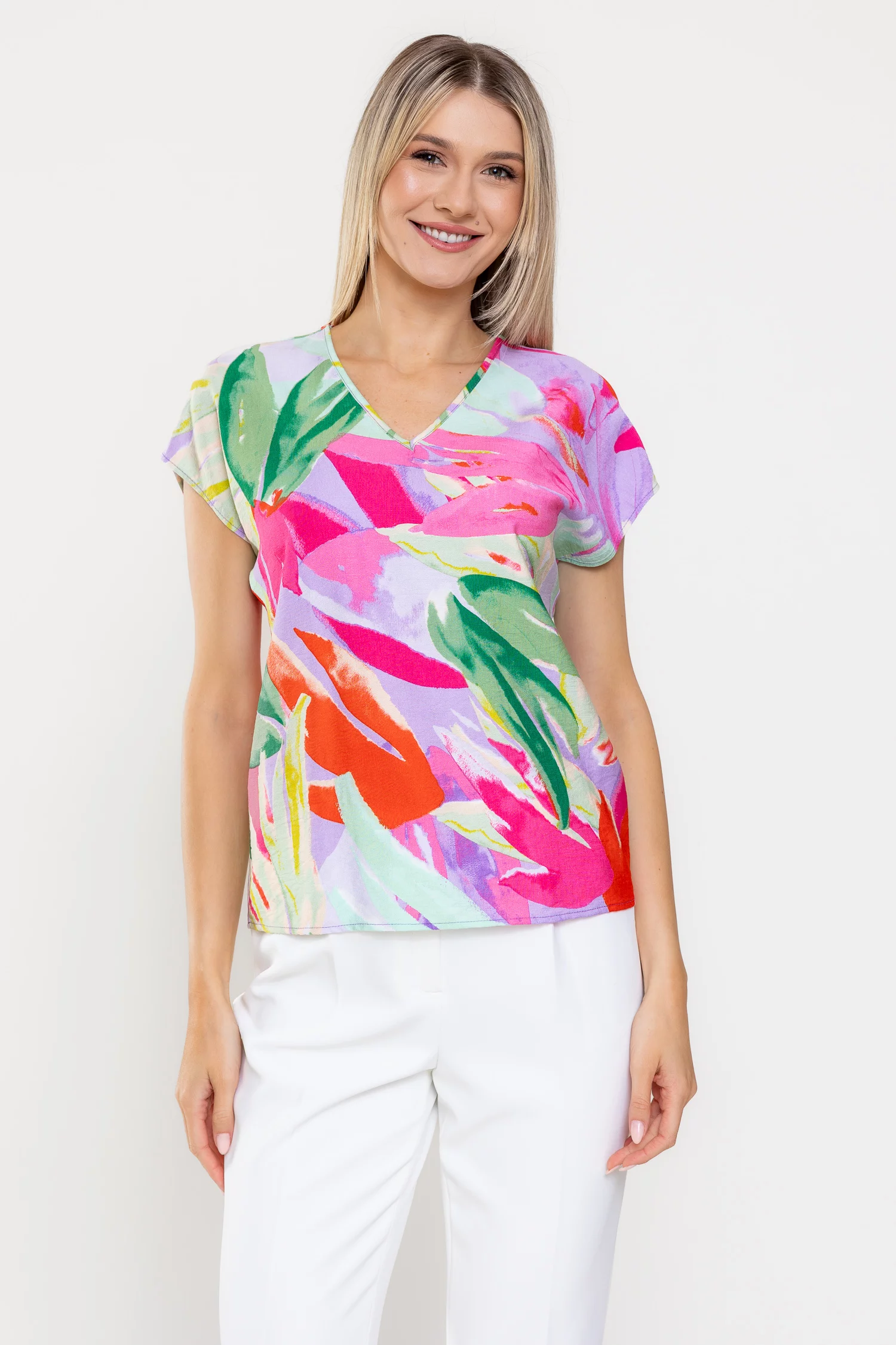 Bluză casual lejeră, confecționată din vâscoză ușoară și plăcută la purtare, ideală pentru zilele calde de vară. Are decolteu în V ce alungește delicat linia gâtului, mâneci scurte cu umeri căzuți pentru un plus de confort și un imprimeu multicolor cu aer estival ce adaugă prospețime oricărei ținute.