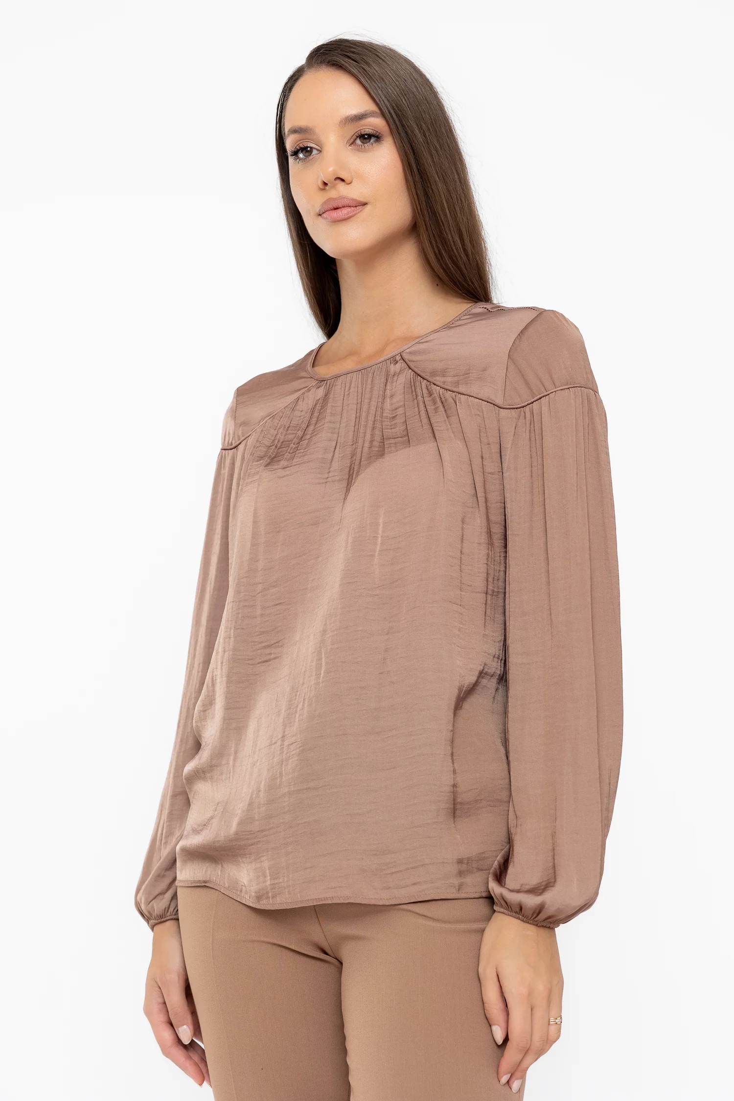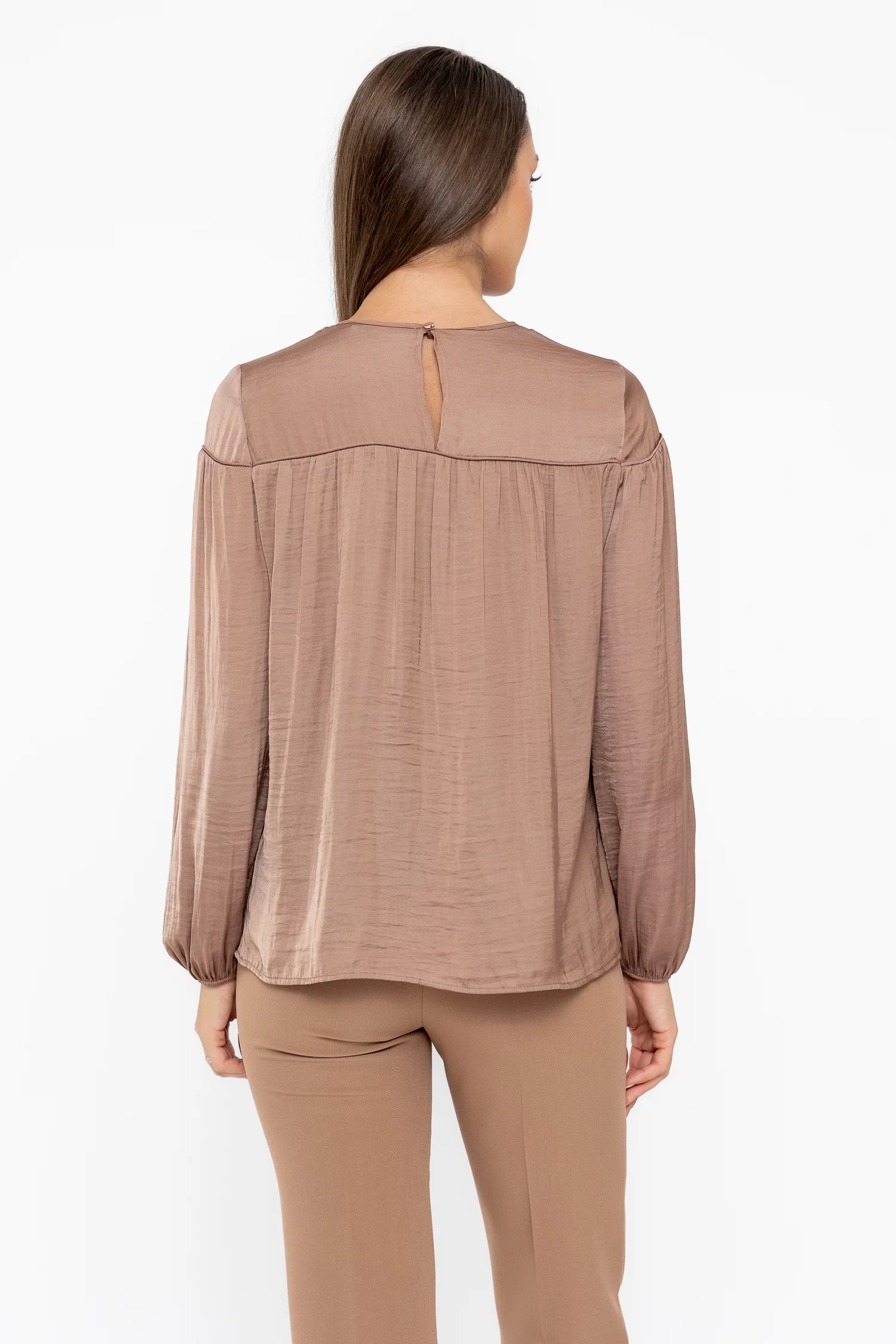 Această bluză elegantă este realizată din voal fluid satinat, un material plăcut și ușor, perfect pentru un look rafinat și confortabil. Are decolteu rotund, mâneci lungi cu mansete elastice și creți decorativice adaugă volum și finețe. Cusătura cu piping subliniază linia elegantă a croiului, iar închiderea la spate cu nasture delicat oferă un plus de feminitate. Versatilă și ușor de purtat, această bluză din voal satinat se potrivește perfect atât cu fuste, cât și cu pantaloni, fiind ideală pentru birou sau ocazii speciale.