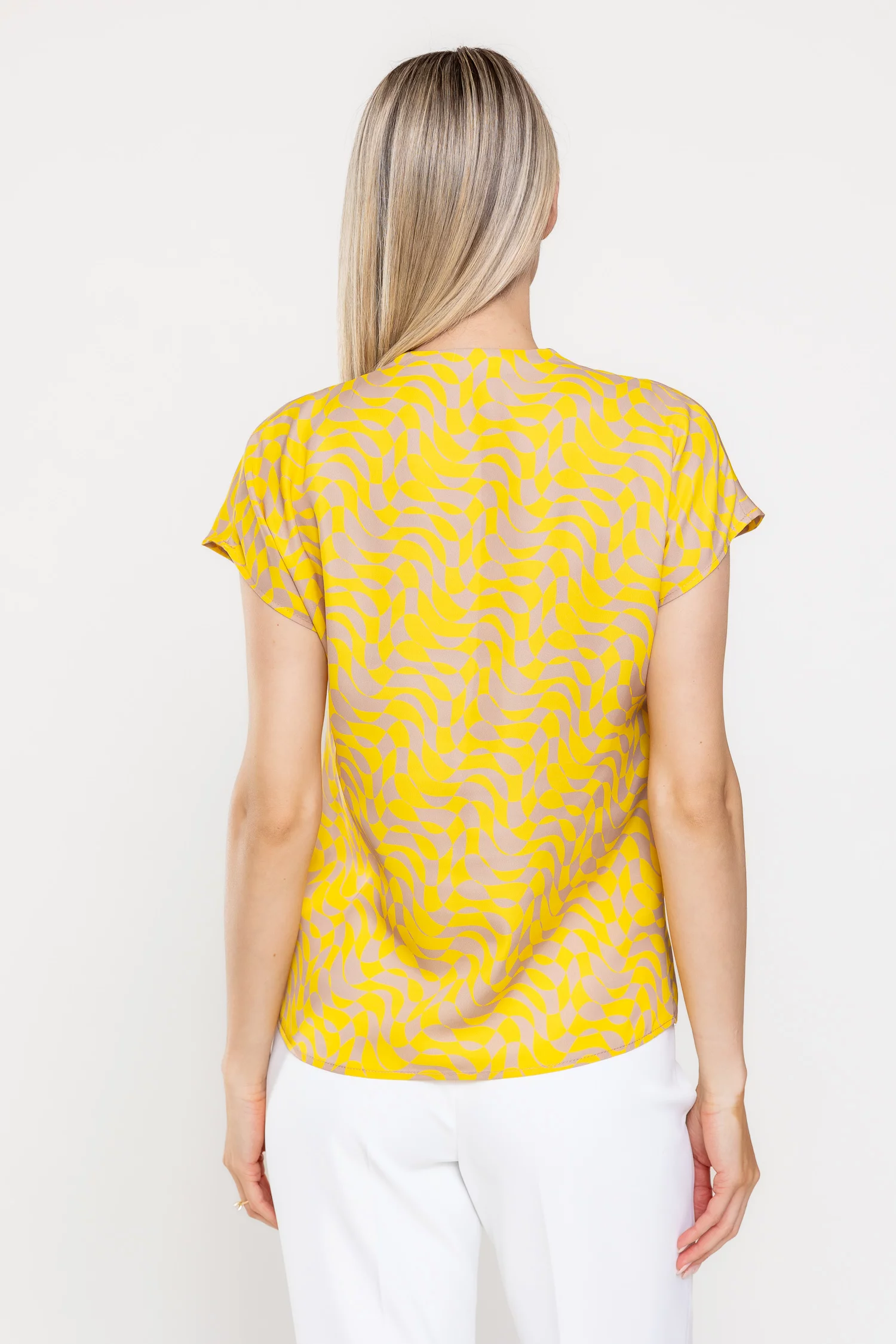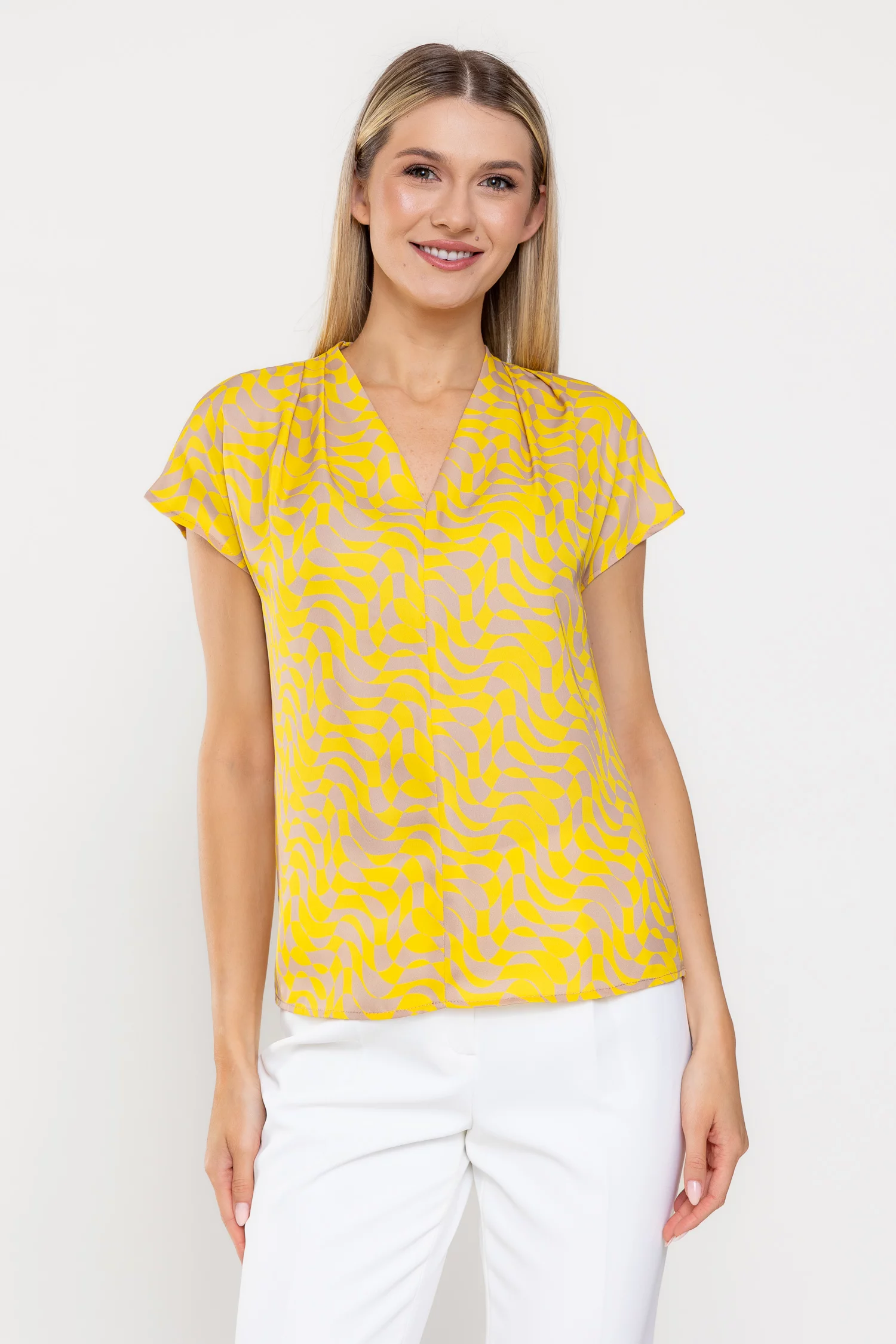Bluză lejeră confecționată din voal satinat, cu un imprimeu geometric modern și atrăgător. Are decolteu în V ce pune frumos în valoare gâtul, mâneci scurte cu umeri căzuți și pliuri decorative în zona umerilor care adaugă un plus de rafinament. O piesă versatilă, ideală pentru ținute casual-chic sau office.