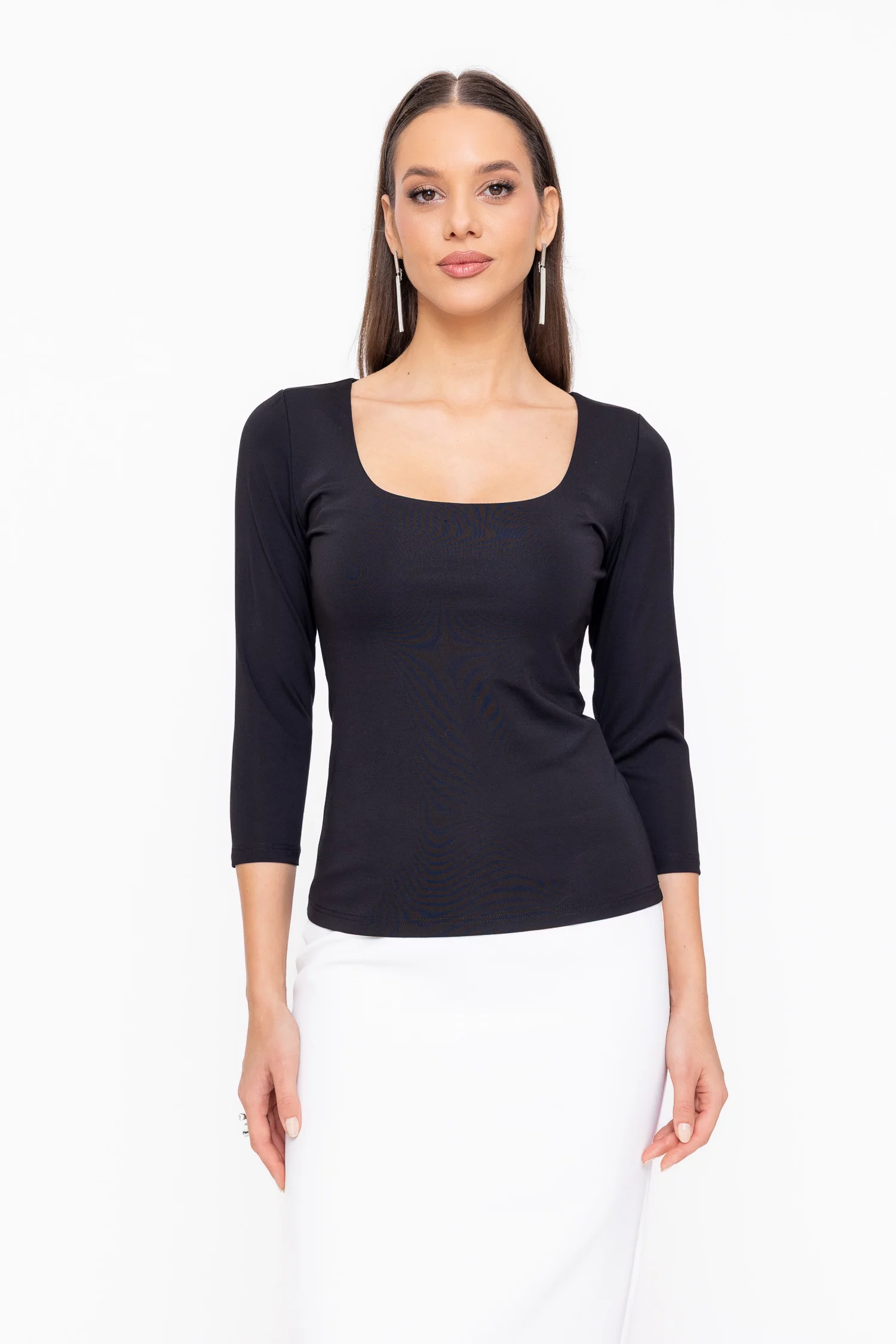 Bluză cambrată din tricot, cu design simplu și elegant, ideală ca piesă de bază în garderoba de zi cu zi. Modelul are decolteu pătrat, care evidențiază delicat zona gâtului, și mâneci trei sferturi, potrivite pentru purtare pe tot parcursul sezonului. Datorită croielii și materialului, bluza este ideală pentru a fi purtată sub sacouri, completând armonios ținutele office. Versatilă și ușor de asortat, poate fi combinată cu succes atât cu fuste, cât și cu pantaloni.