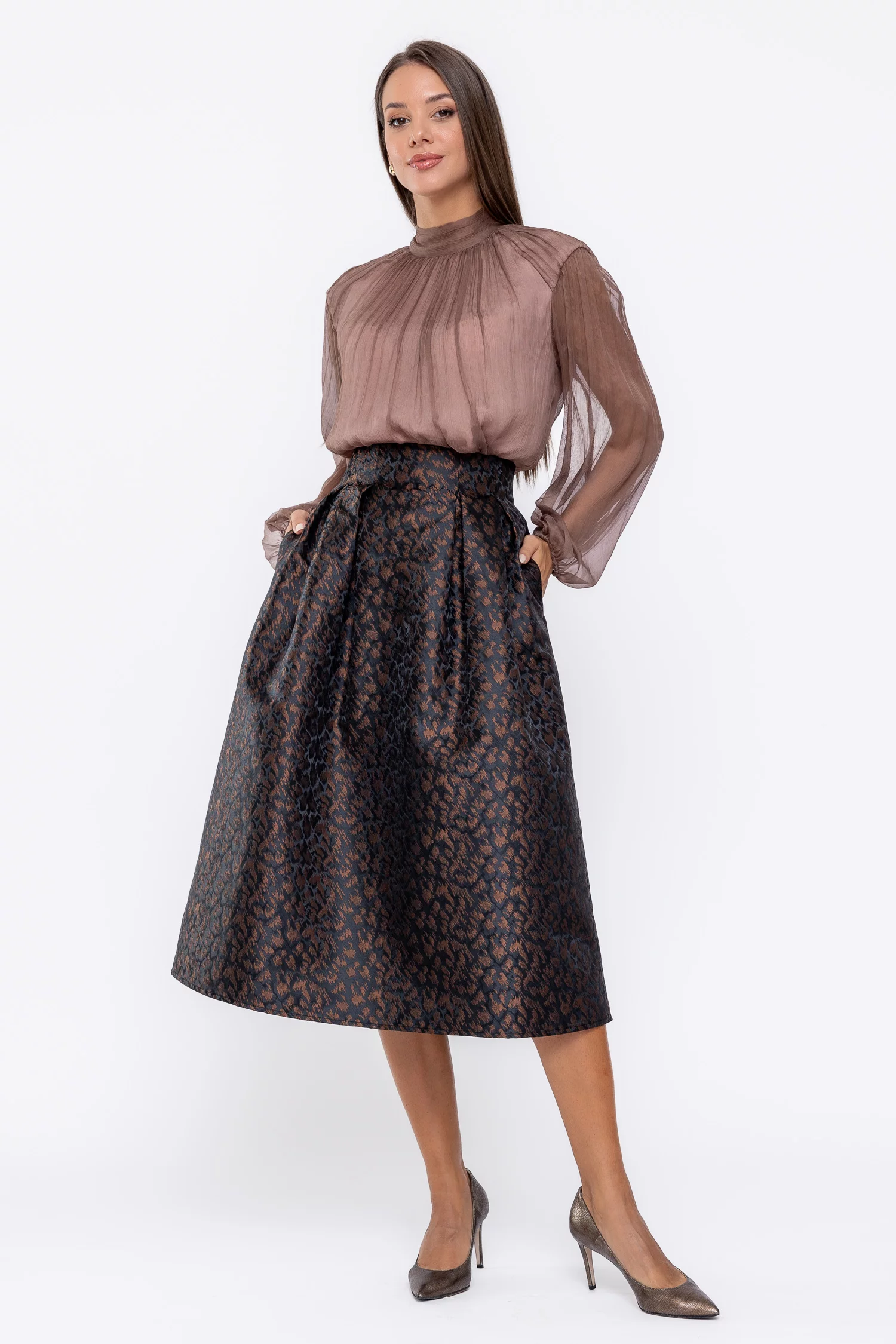 Bluză Caramel elegantă mătase naturală cu creți decorativi mocha B4537