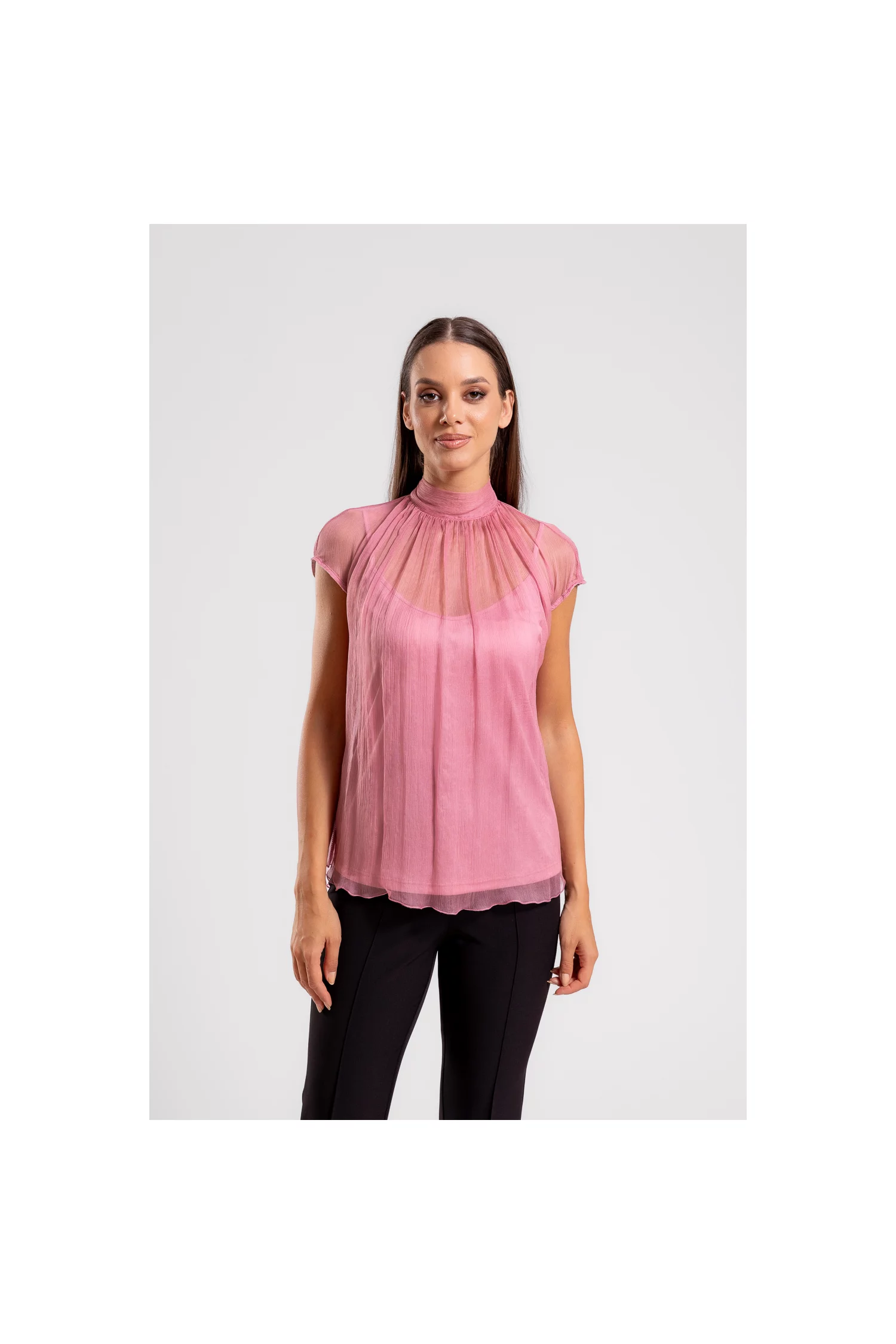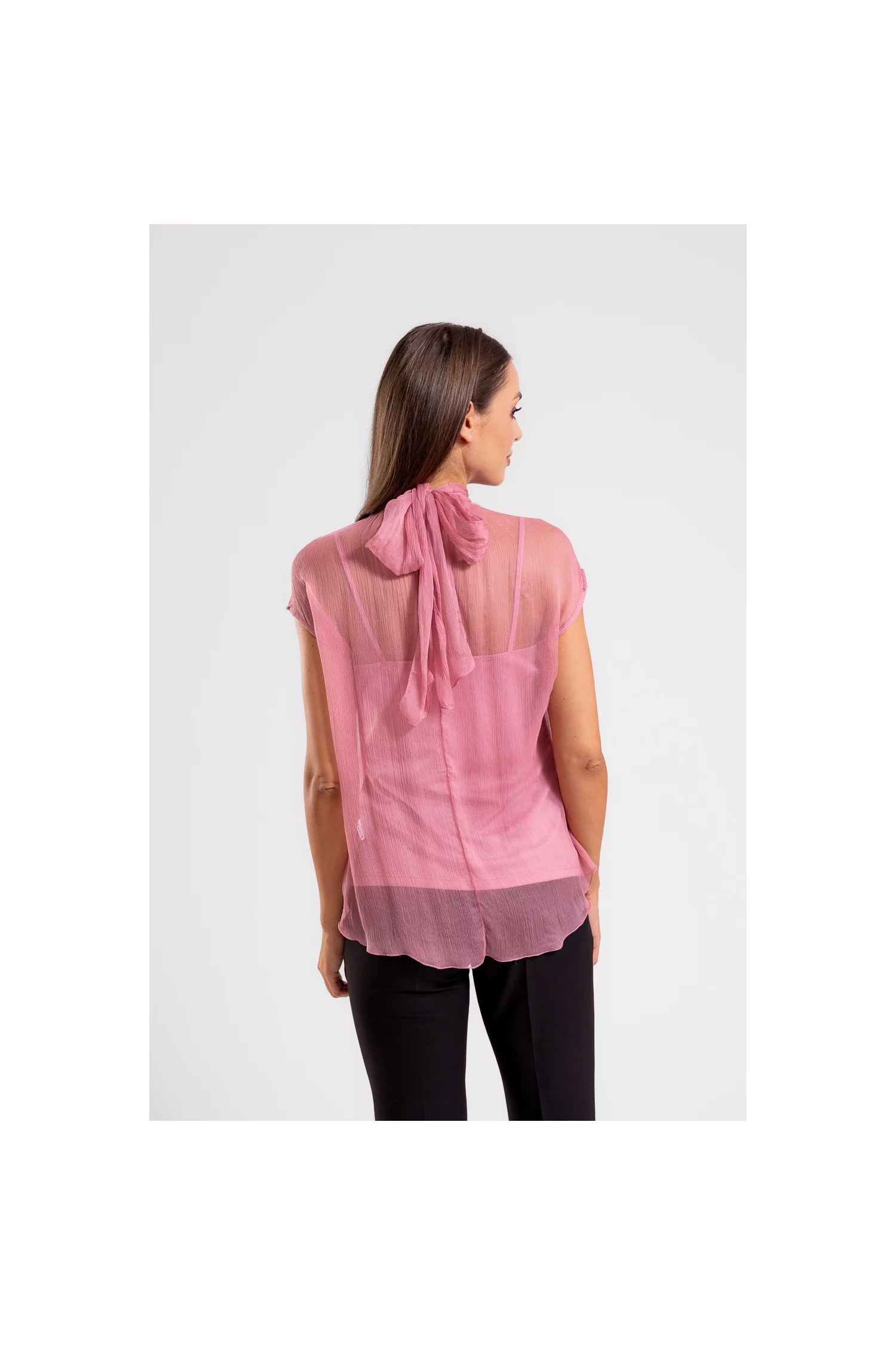 Această bluză elegantă, confecționată din mătase naturală de înaltă calitate, este alegerea perfectă pentru un look sofisticat și feminin. Decolteul rotund, amplasat delicat pe gât, este completat de un detaliu chic la spate, unde bluza se leagă într-o fundă elegantă, adăugând un plus de farmec și originalitate. Mânecile scurte, cu umeri căzuți, oferă un aspect lejer și modern, menținând în același timp eleganța clasică a piesei. Bluză vine cu o căptușeală tip maiou detașabilă, confecționată din vâscoză, asigurând confort și acoperire discretă.