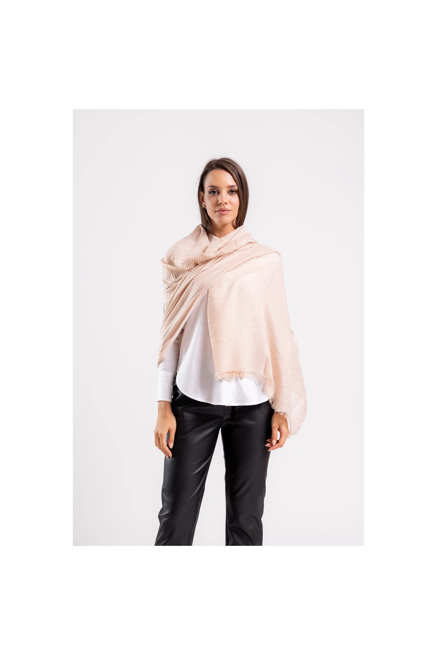 Această eșarfă maxi plisată este accesoriul perfect pentru a adăuga o notă de eleganță și rafinament ținutelor tale. Confectionată dintr-un material ușor și fluid, eșarfa se remarcă prin firul lucios subtil care îi conferă un efect delicat de strălucire, ideal pentru un look sofisticat, de zi sau de seară. Franjurii discreți de pe margini adaugă o notă modernă și stilată, completând designul acestei piese versatile. Cu dimensiuni generoase, eșarfa poate fi purtată în diferite stiluri, oferindu-ți libertatea de a crea un look personalizat, fie că o porți pe umeri sau înfășurată lejer în jurul gâtului. Perfectă pentru a-ți completa ținutele în sezonul rece sau pentru a adăuga un detaliu strălucitor la evenimente speciale, această eșarfă maxi plisată devine rapid un accesoriu esențial în garderoba ta.
