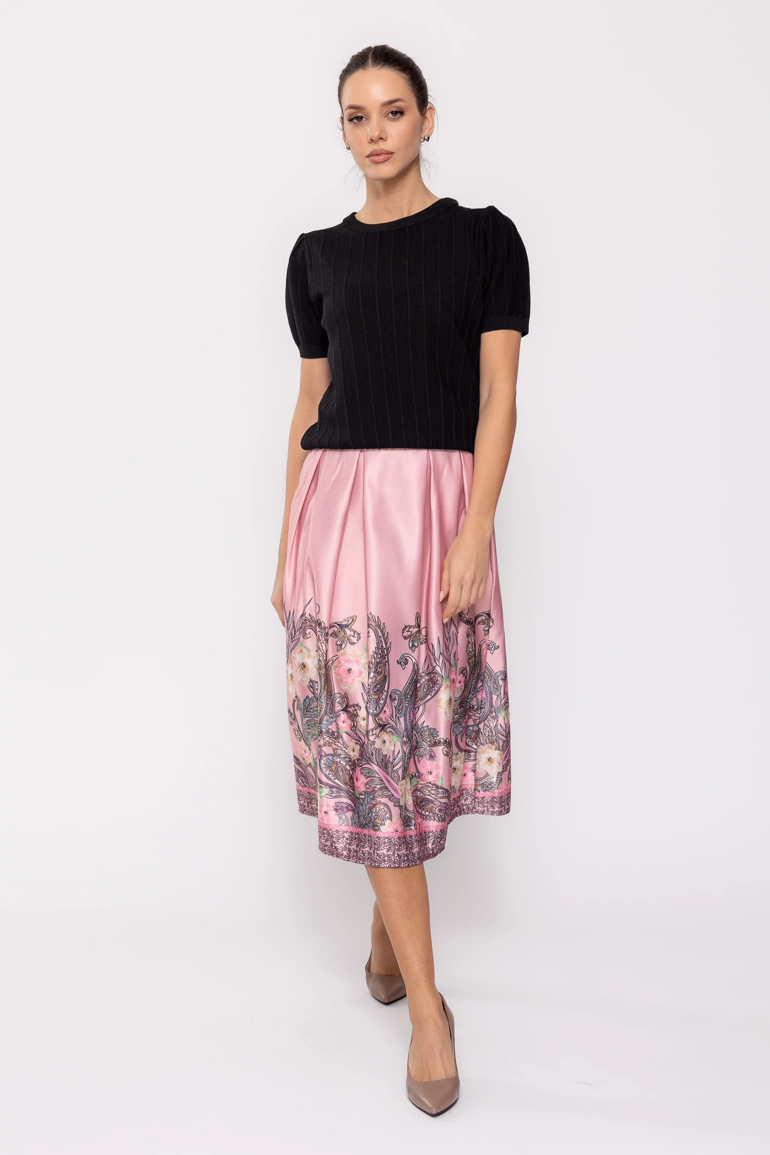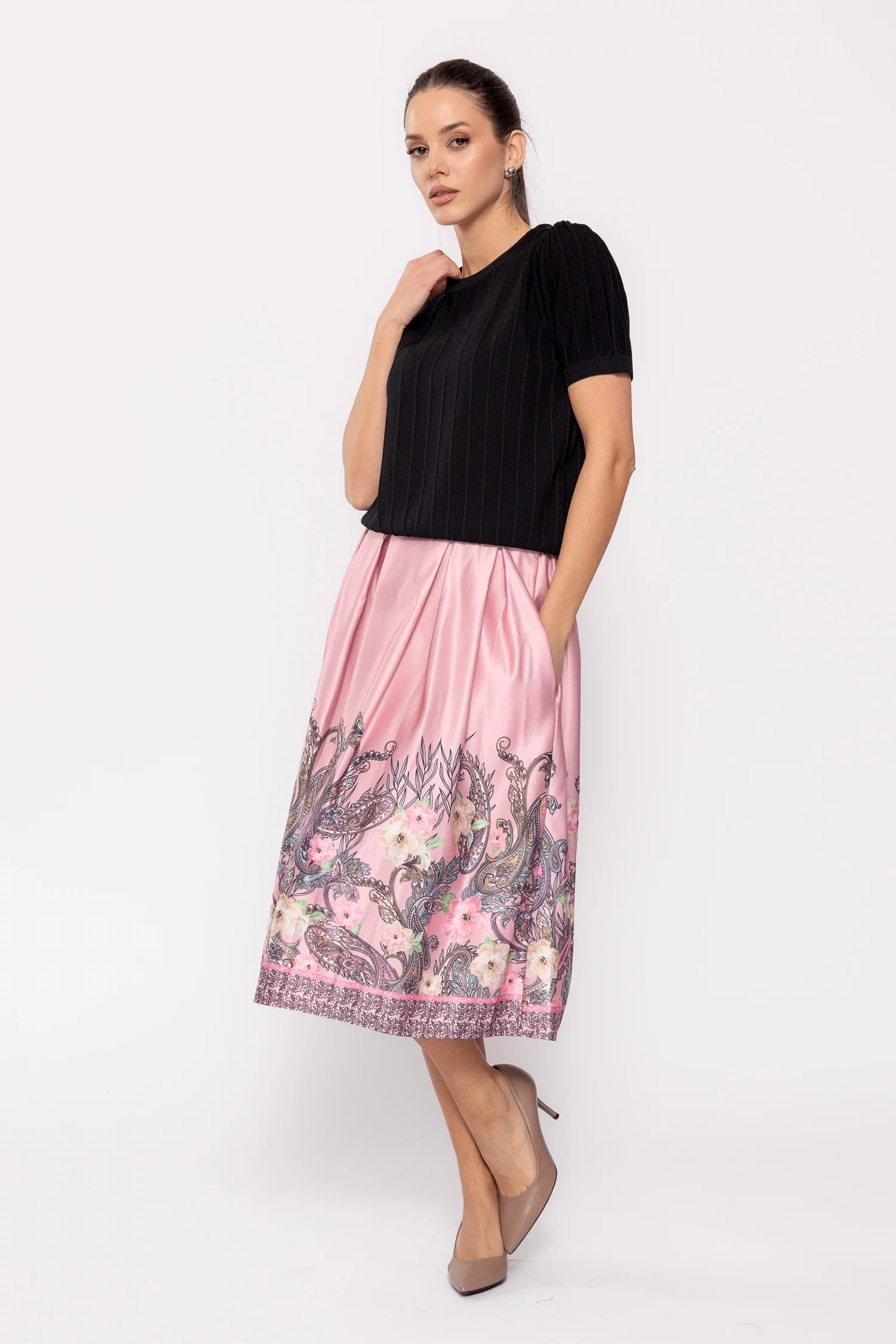 Modelul nostru are 1.75 m înalțime, bust 88 cm, talie 67 cm, șold 94 cm si poartă o fustă mărime universală.