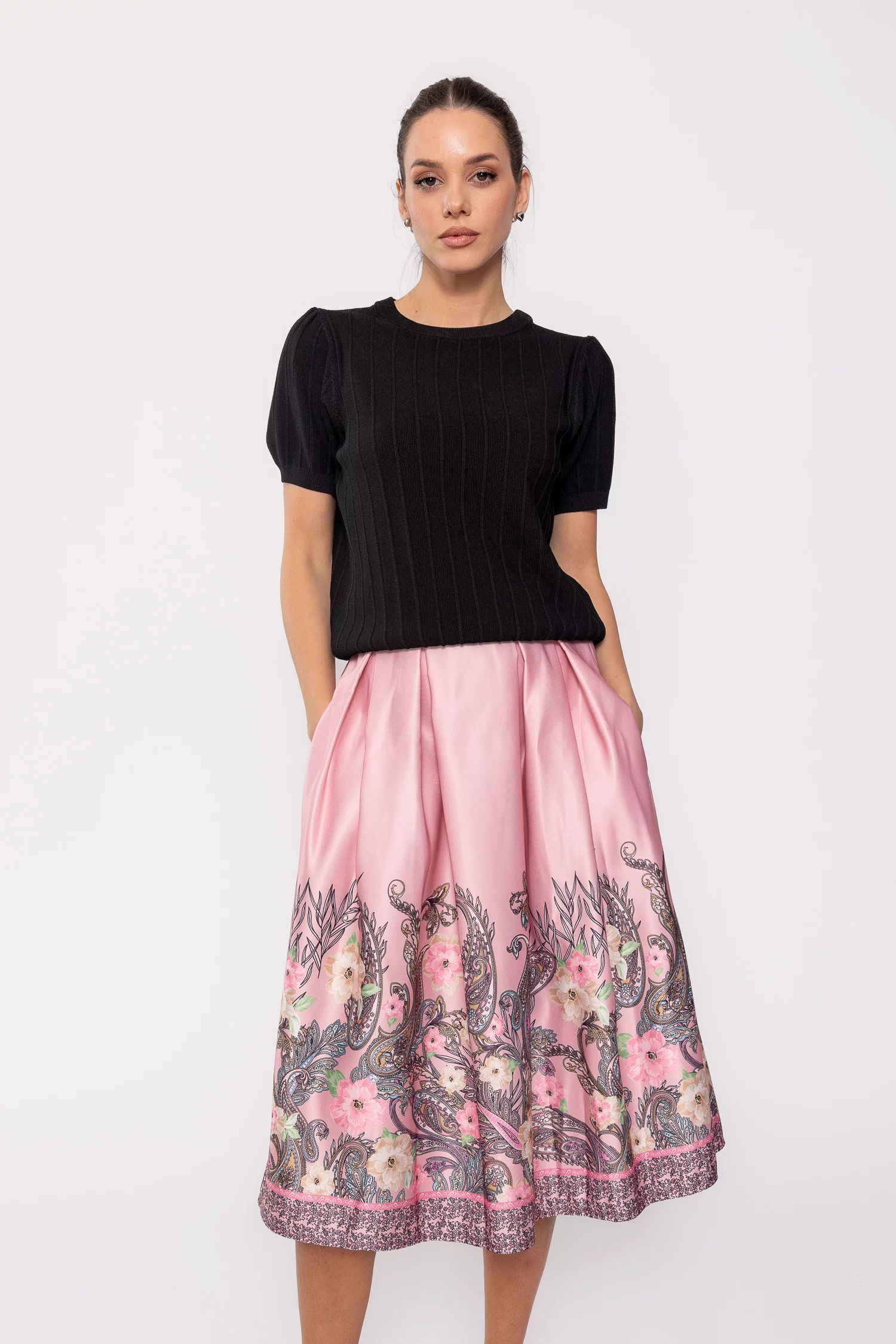 Descoperă feminitatea și eleganța într-o piesă versatilă și stilată - fusta midi în pliuri cu un fermecător imprimeu floral. Această fustă aduce un strop de prospețime și culoare în garderoba ta, fiind perfectă pentru a-ți completa ținutele de primăvară și vară.Cu un design clasic în pliuri, această fustă emană rafinament și stil, iar imprimeul floral adaugă o notă de feminitate și eleganță. Talia elastică la spate asigură o potrivire confortabilă și adaptabilă, în timp ce buzunarele laterale funcționale adaugă un element practic și util.Confecționată dintr-un material ușor și plăcut la atingere, această fustă este ideală pentru a te simți confortabilă și încrezătoare în orice moment al zilei. Poartă-o cu o bluză simplă și sandale pentru un look casual și relaxat sau asorteaz-o cu o cămașă elegantă și pantofi cu toc pentru o apariție mai rafinată și sofisticată.Indiferent de ocazie, fusta noastră midi în pliuri cu imprimeu floral este alegerea perfectă pentru a atrage priviri admirative și complimente. Optează pentru feminitate și stil cu această fustă și bucură-te de eleganța și confortul pe care ți le oferă în fiecare purtare!
