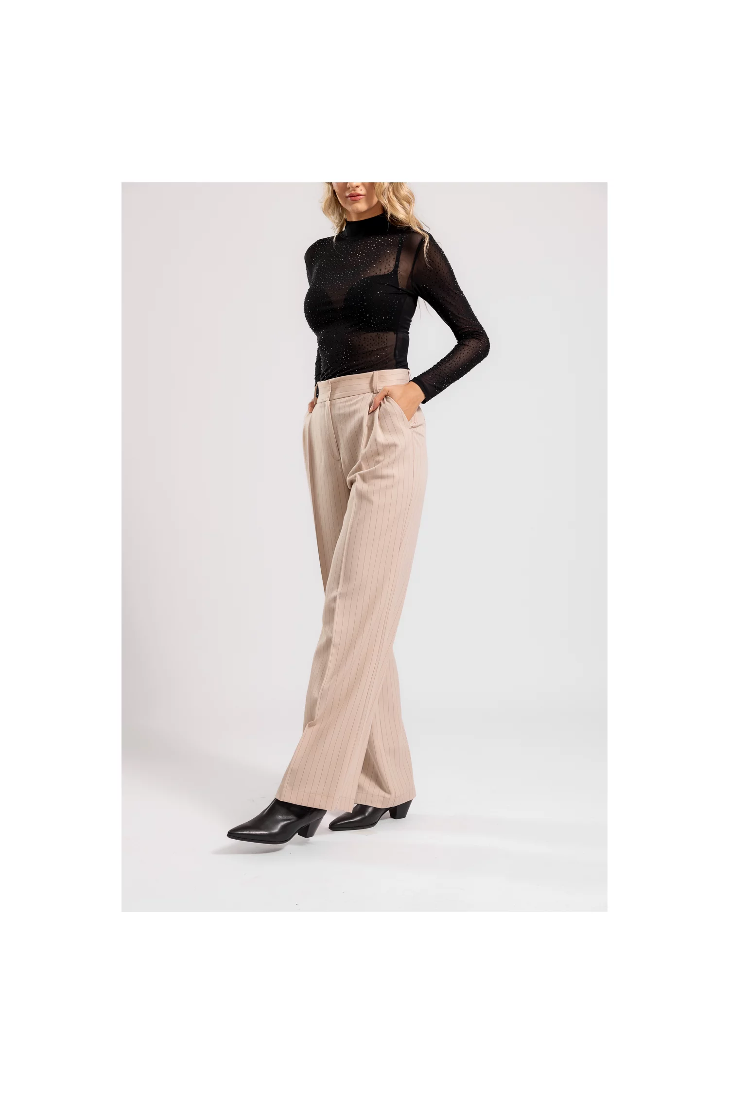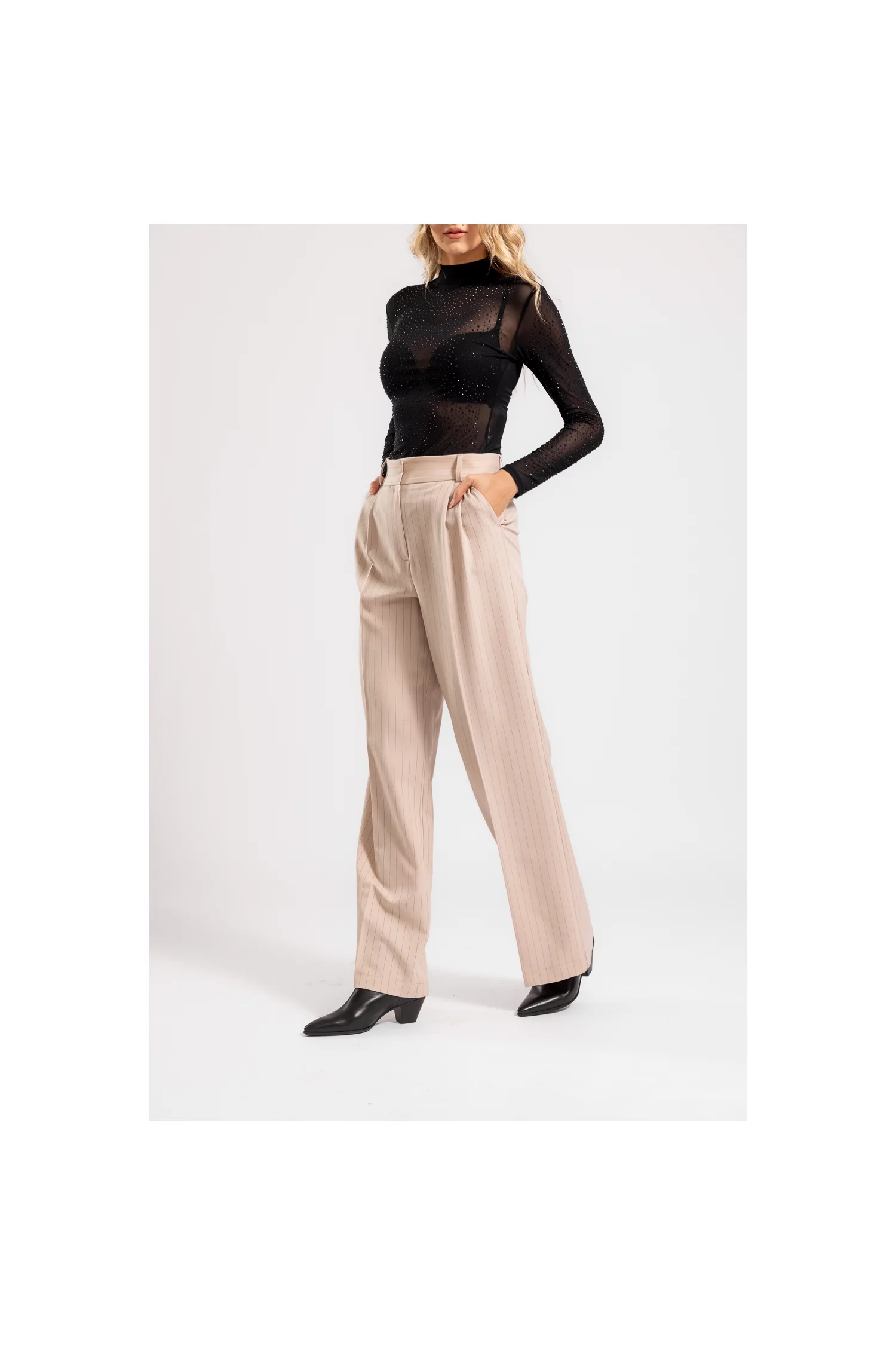 Modelul nostru are 1.75 m înalțime, bust 88 cm, talie 67 cm, șold 94 cm si poartă un pantalon marimea 36.