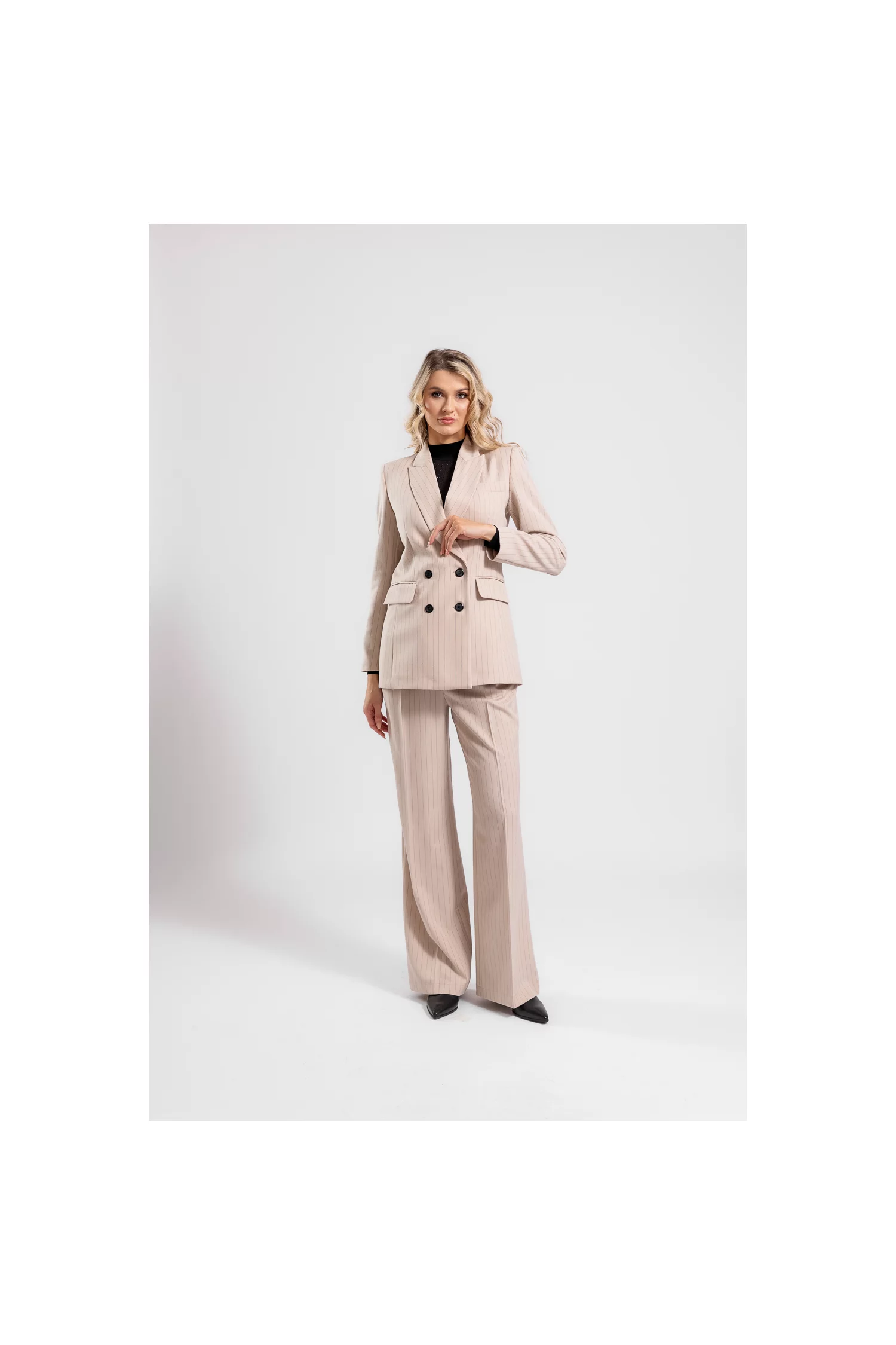 Pantalonul Caramel Collection evazat, cu talie înaltă și croială sofisticată, este alegerea perfectă pentru o ținută office sau elegantă. Realizat dintr-o stofă bleumarin fină, cu dungi discrete, pantalonul adaugă un aer de rafinament și profesionalism oricărui outfit. Pliurile decorative și găicile pentru curea completează designul, în timp ce nasturii metalici aurii aduc un plus de strălucire subtilă. Talie înaltă subliniază silueta și oferă un aspect alungit și bine definit. Acest model versatil este ideal pentru a fi combinat cu bluze sau sacouri, transformându-se într-o piesă statement pentru garderoba ta.