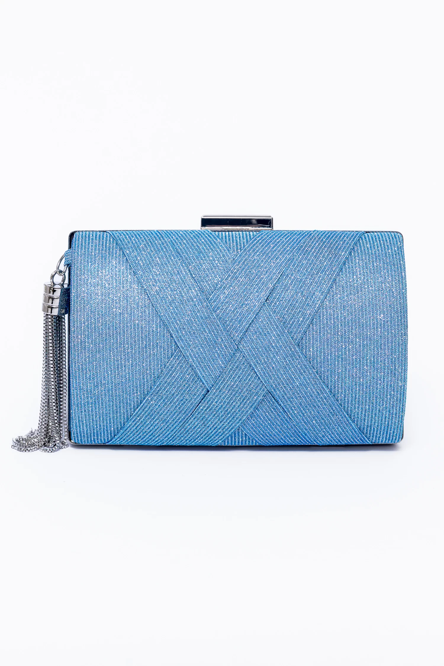 Posetă elegantă cu finisaj lurex, decorată cu benzi încrucișate ce oferă un efect vizual sofisticat. Accesorizată cu ciucure metalic lateral, are formă dreptunghiulară ușor bombată și este prevăzută cu două lungimi de lanț pentru purtare versatilă, atât pe umăr, cât și în mână. Potrivită pentru evenimente și ocazii speciale.