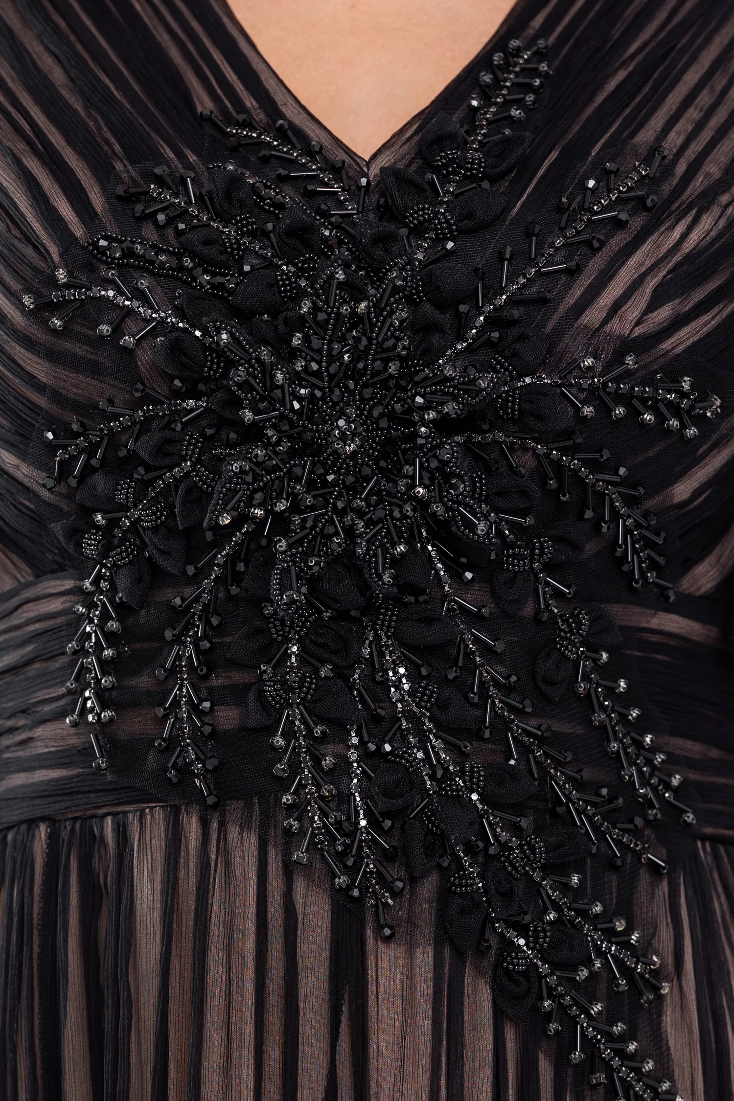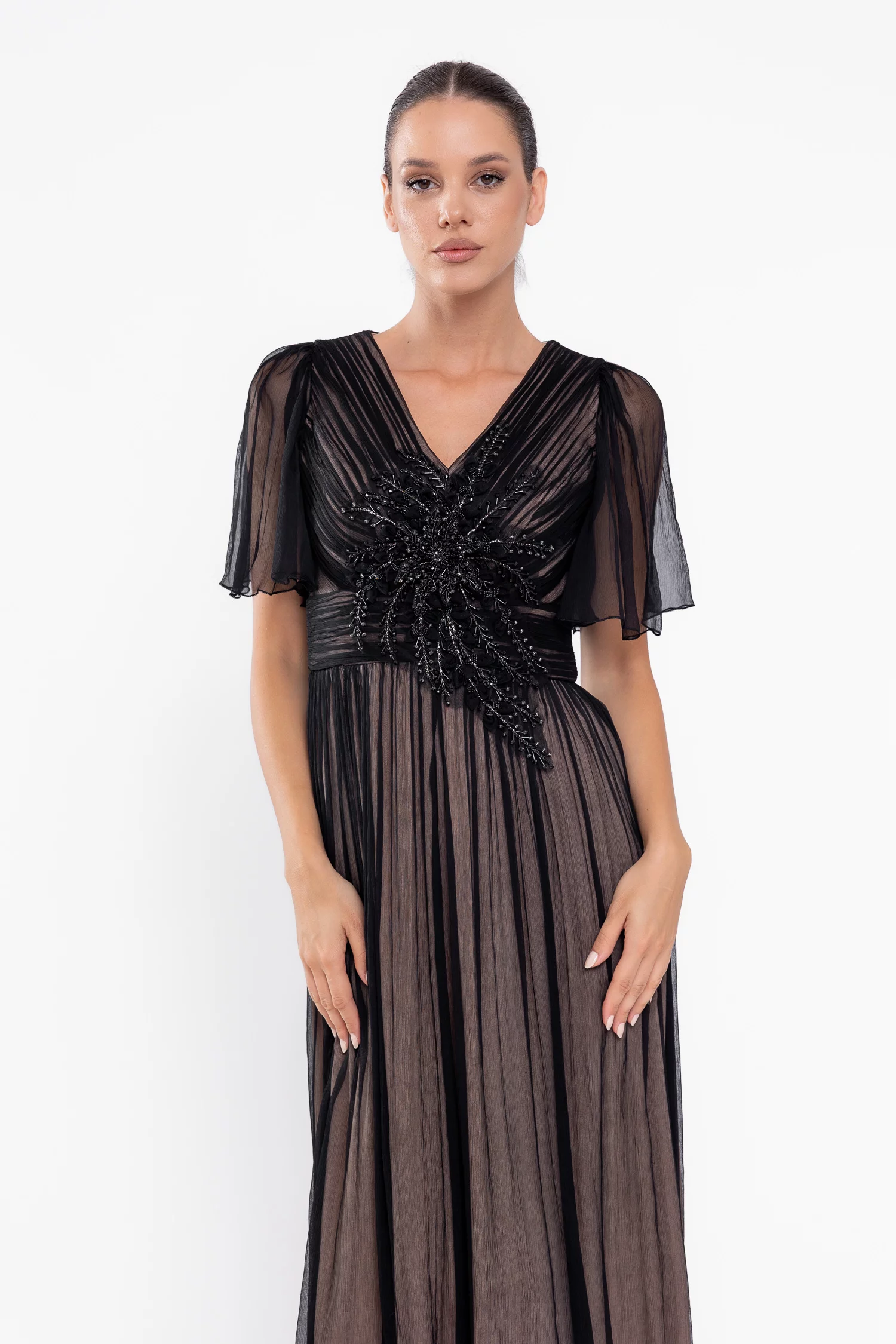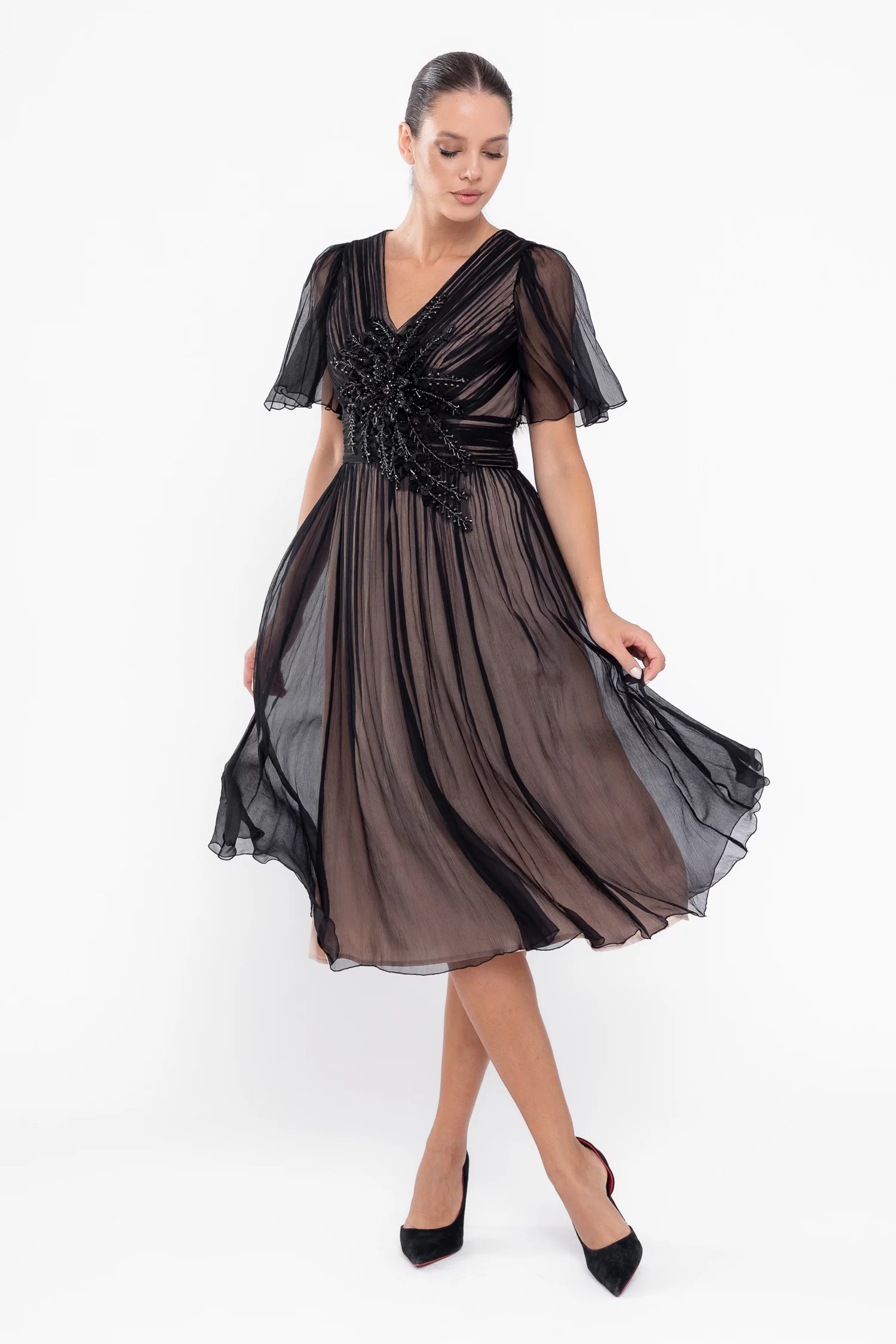 Rochie Caramel elegantă mătase naturală cu aplicație florală neagră R8568