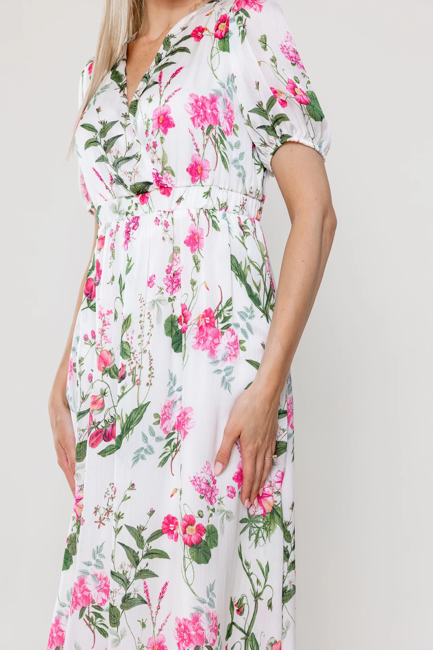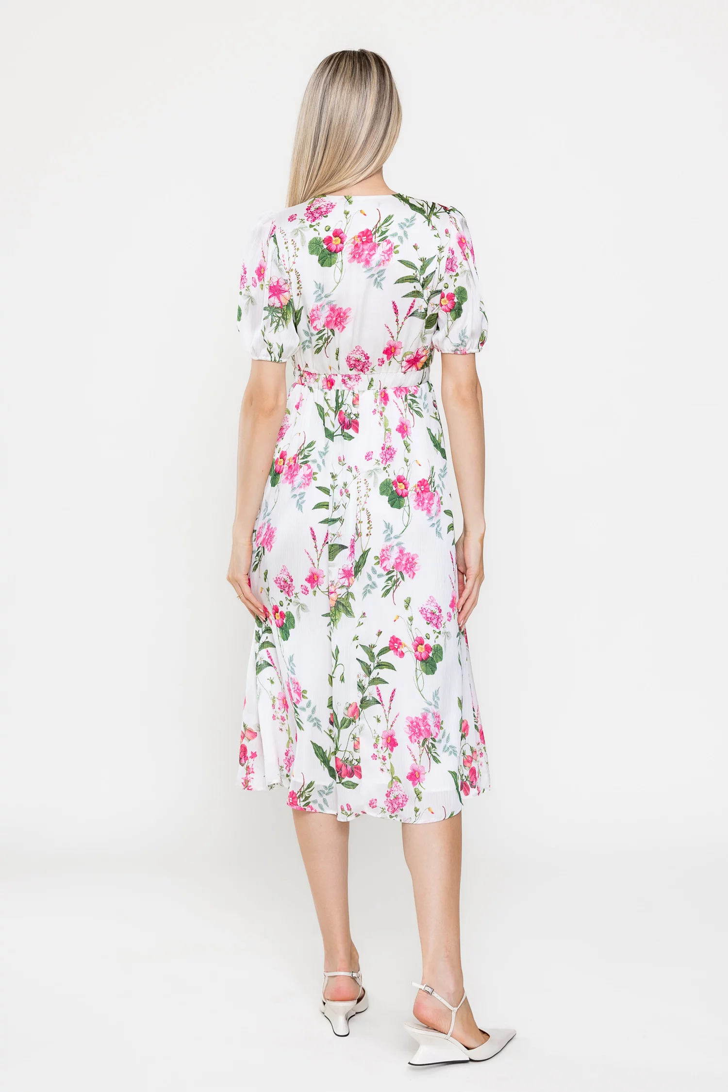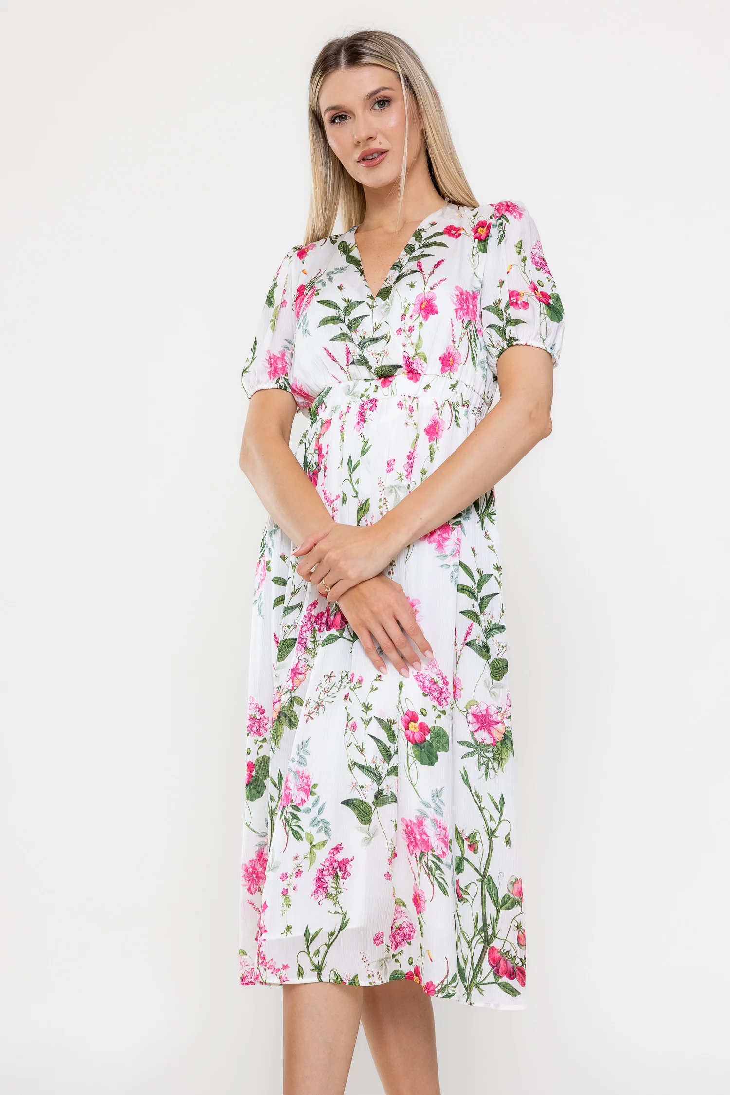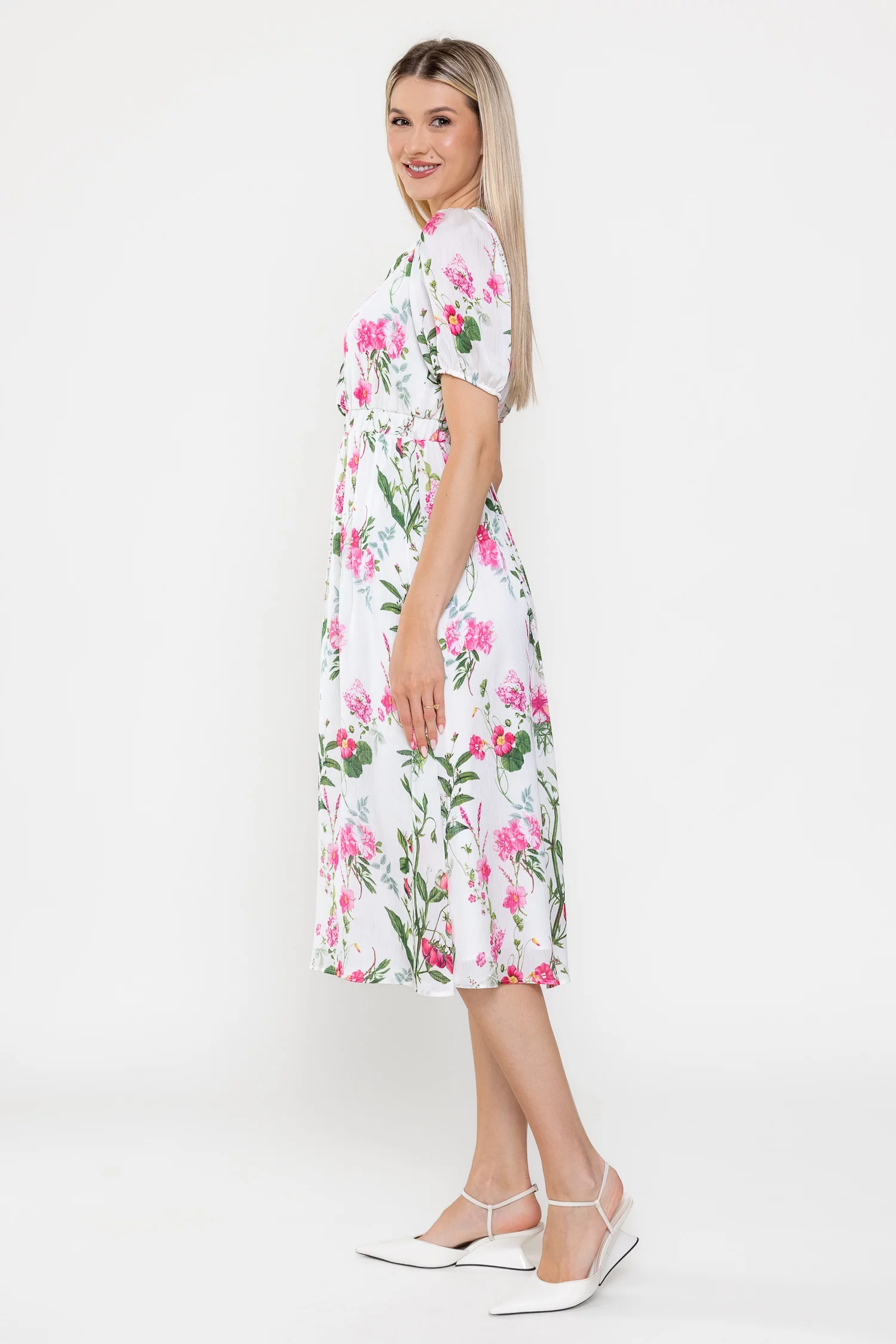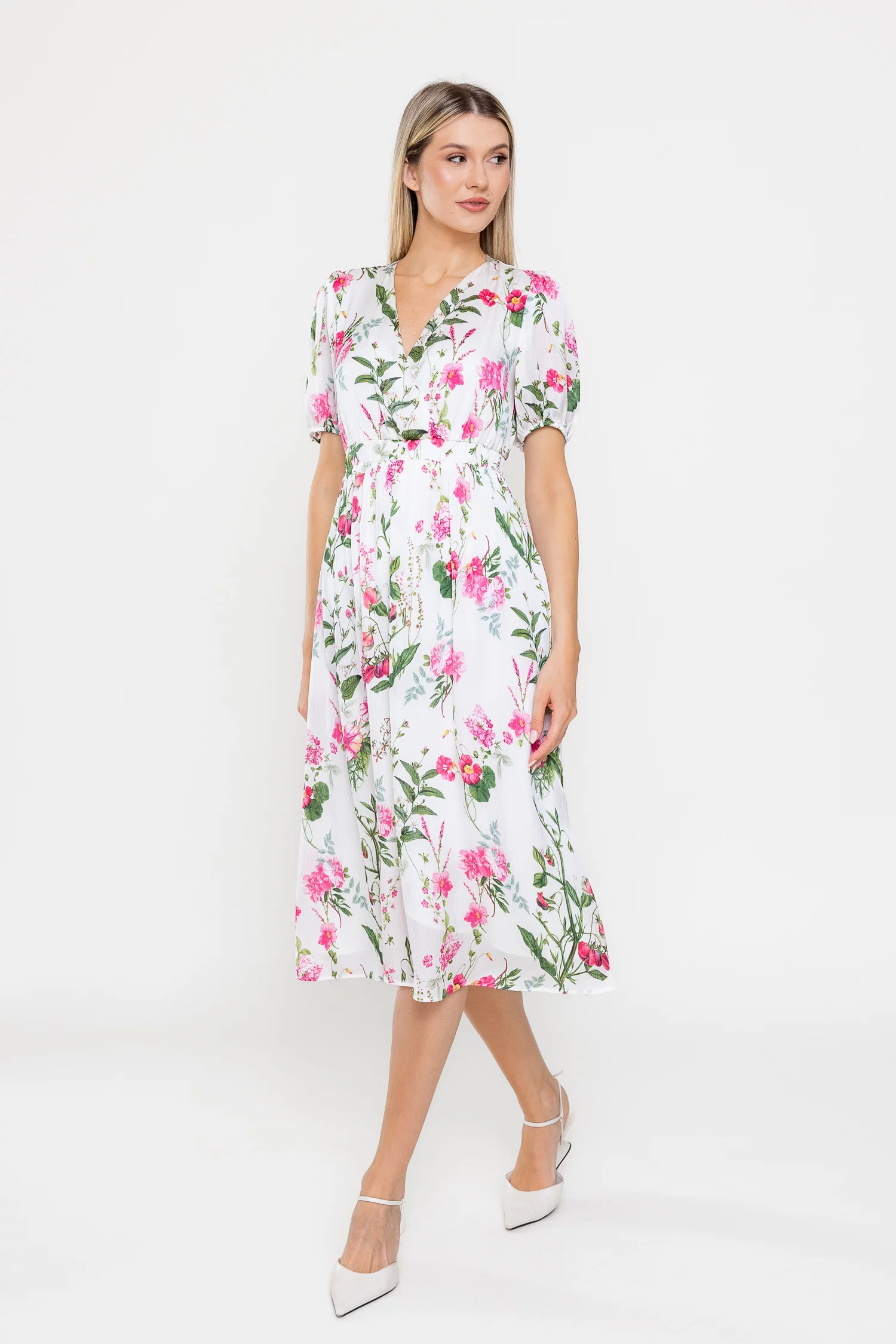 Rochie midi confecționată din voal vaporos cu imprimeu floral delicat, ideală pentru zilele călduroase. Decolteul în V suprapus și mânecile scurte cu mansete elastice adaugă un plus de feminitate și confort. Talia este evidențiată de o bandă elastică lată, iar fusta midi în cloș conferă lejeritate și eleganță în mișcare.