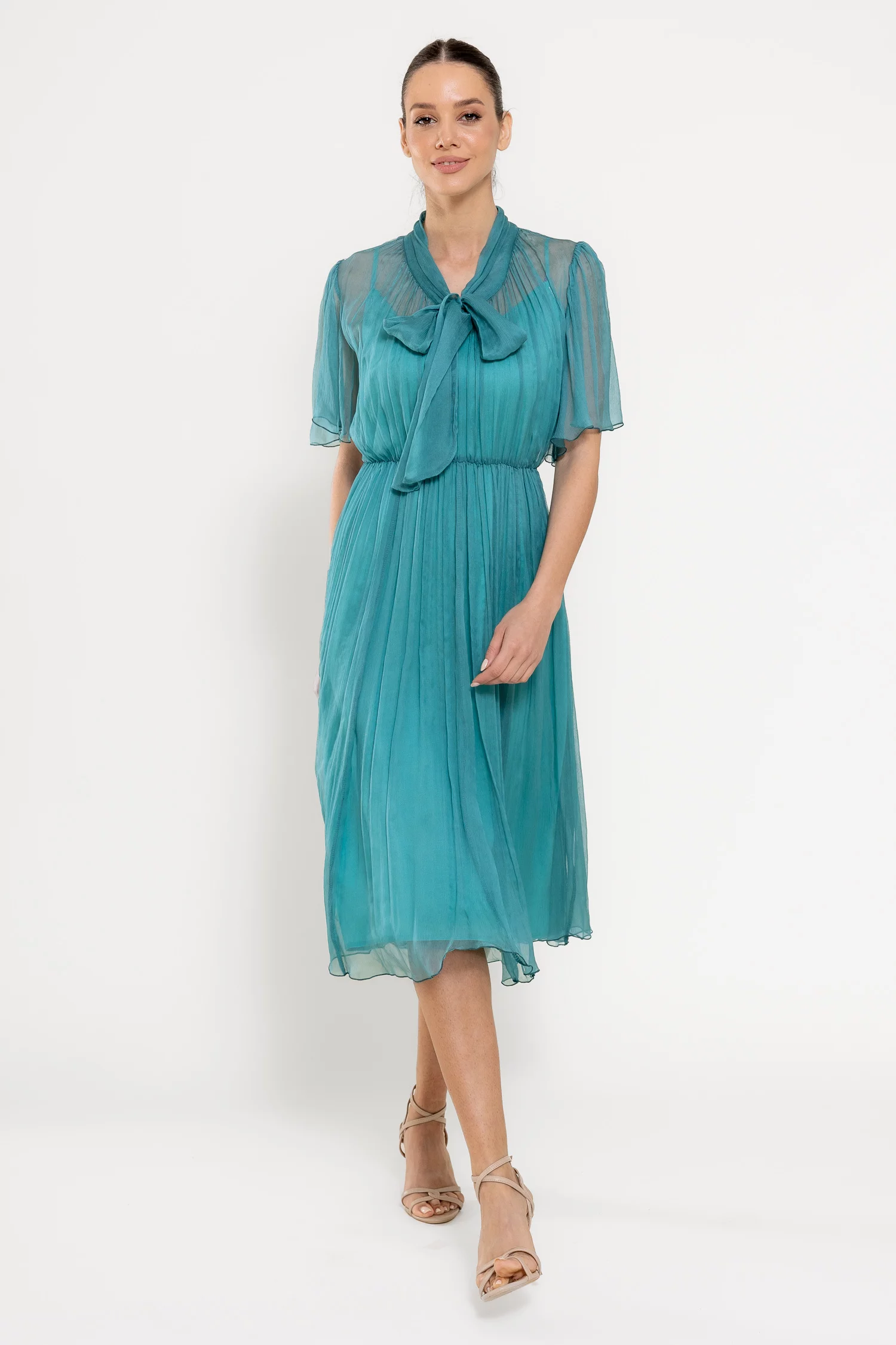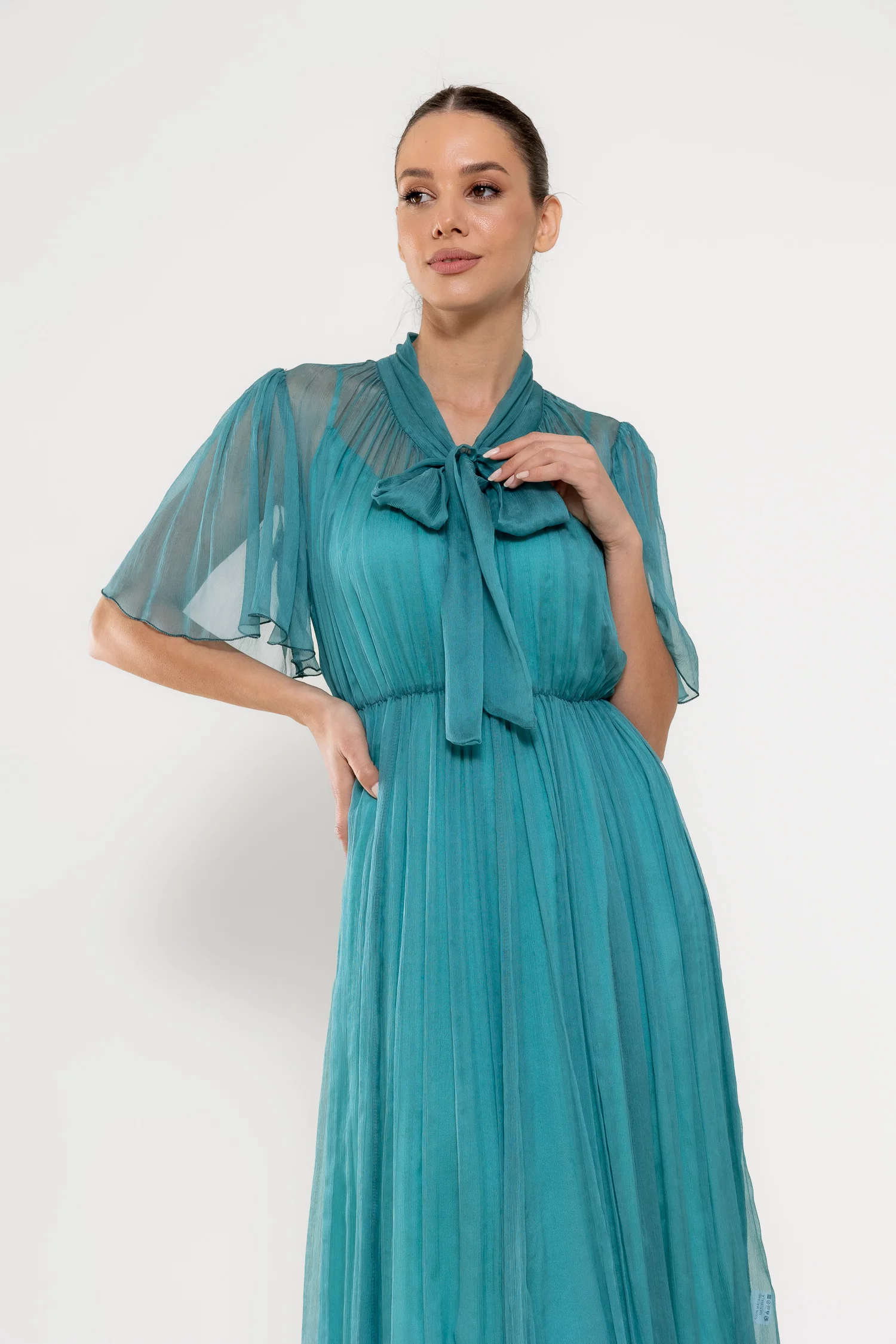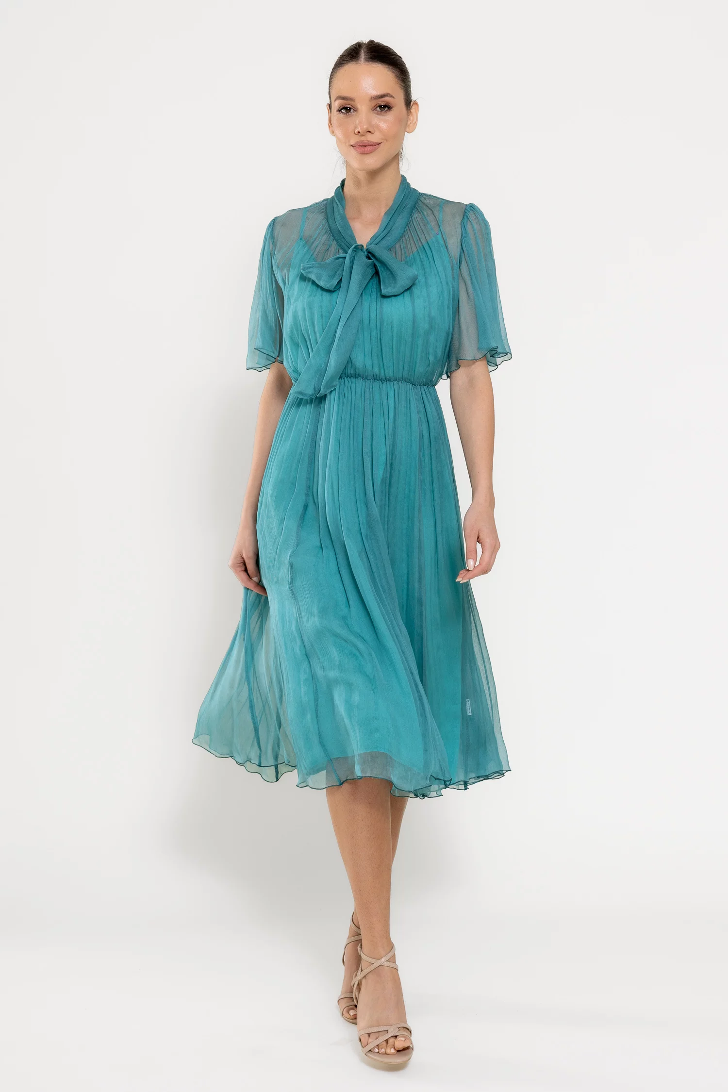 Rochie midi elegantă, realizată din mătase naturală cu textură fluidă, ce conferă un aer sofisticat și lejer. Decolteul în V este pus în valoare de o eșarfă decorativă delicată, iar mânecile scurte tip clopot adaugă o notă feminină. Croiala lejeră este armonios echilibrată de talia elastică, care subliniază silueta. Este completată de o jupă detașabilă din fibre naturale de vâscoză, pentru un plus de confort și versatilitate. Ideală pentru ocazii rafinate sau apariții de zi cu un aer elegant.