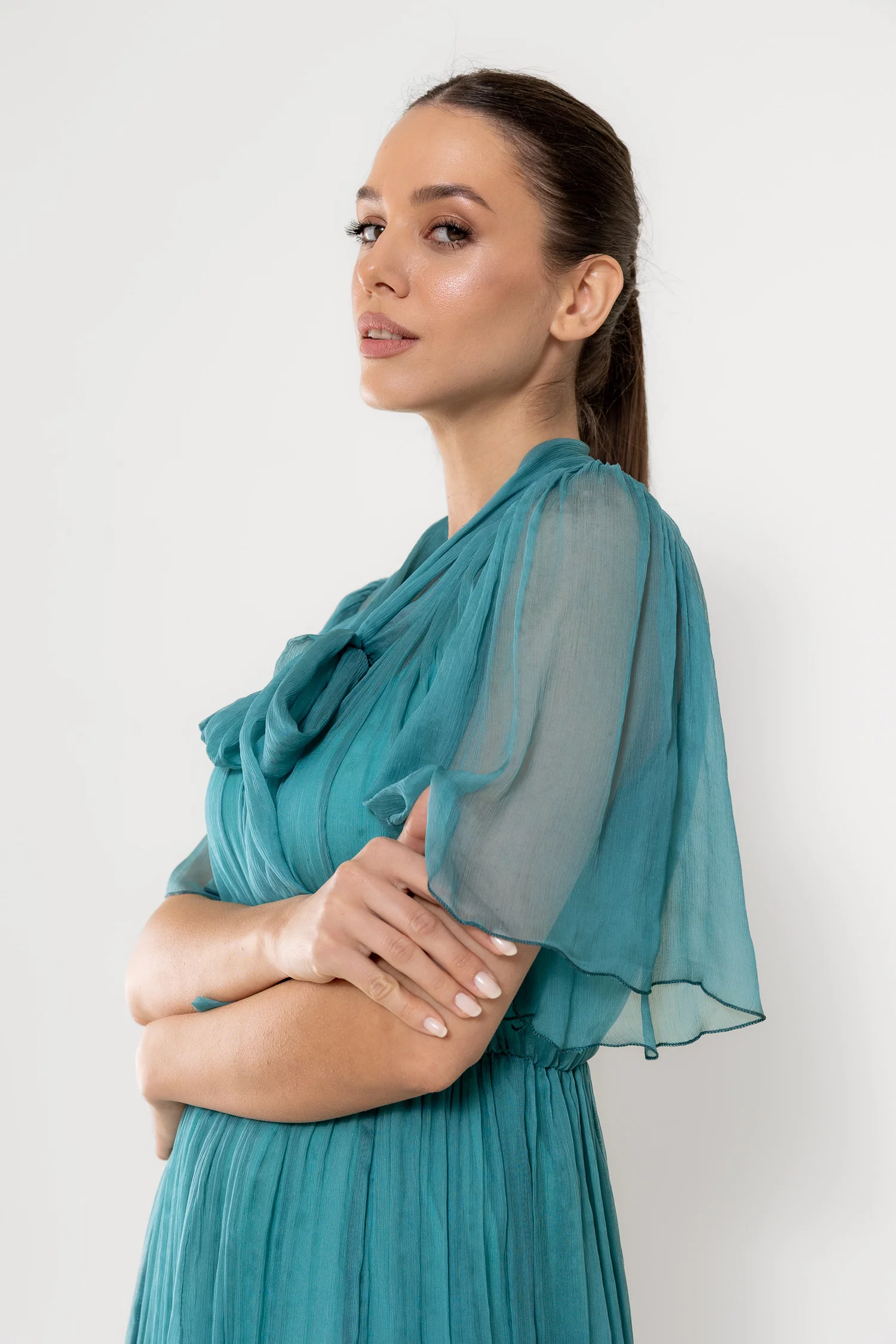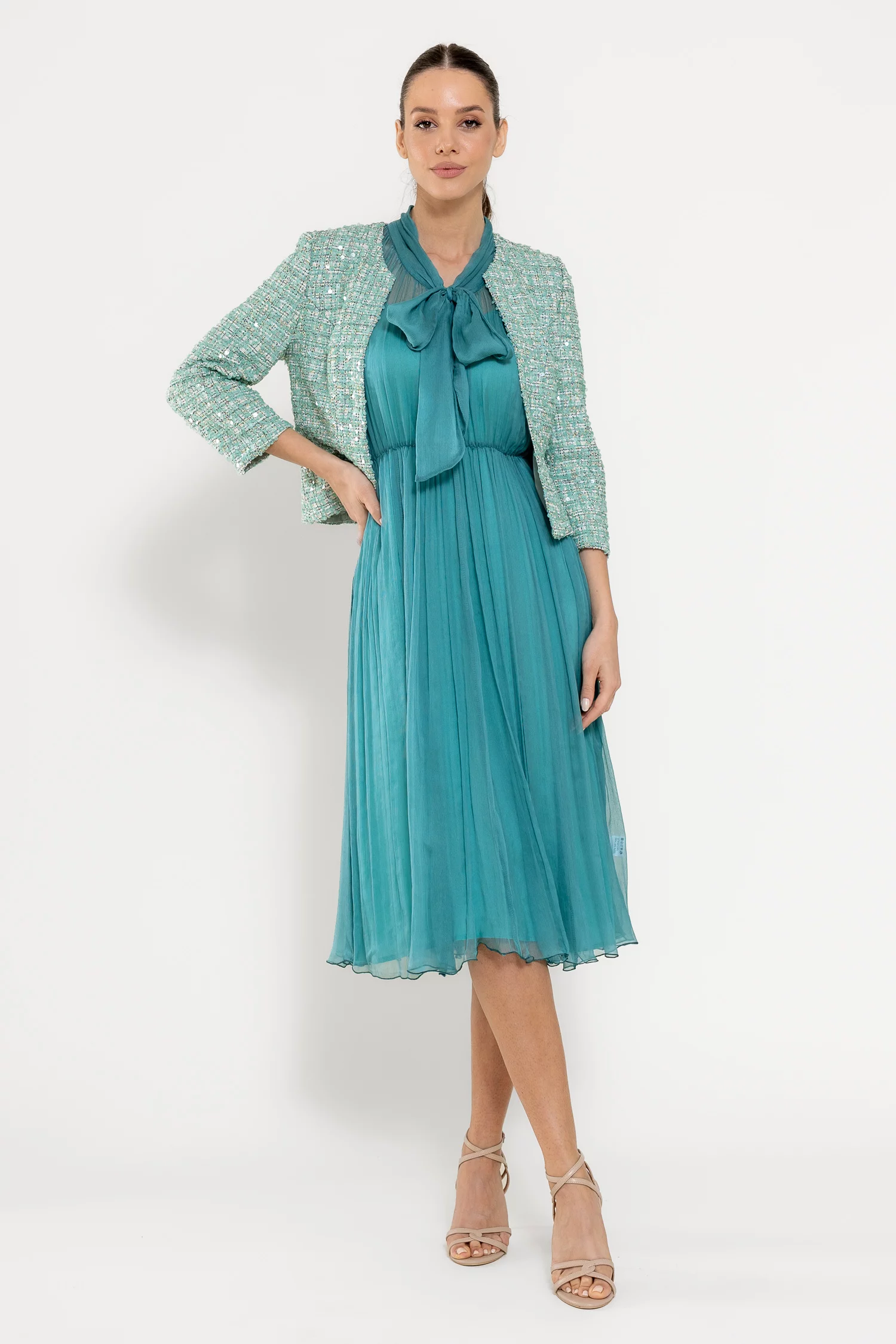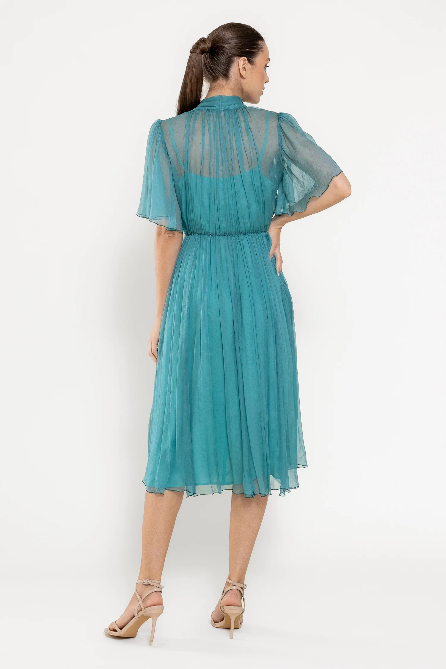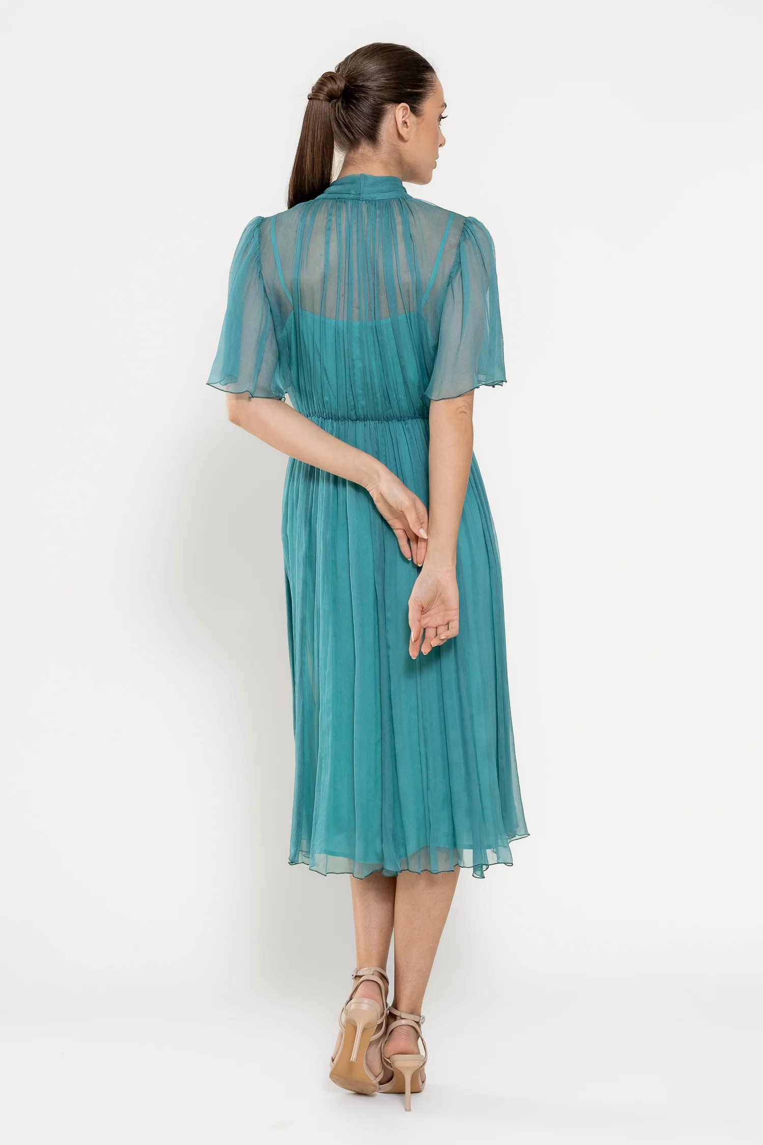 Rochie midi elegantă, realizată din mătase naturală cu textură fluidă, ce conferă un aer sofisticat și lejer. Decolteul în V este pus în valoare de o eșarfă decorativă delicată, iar mânecile scurte tip clopot adaugă o notă feminină. Croiala lejeră este armonios echilibrată de talia elastică, care subliniază silueta. Este completată de o jupă detașabilă din fibre naturale de vâscoză, pentru un plus de confort și versatilitate. Ideală pentru ocazii rafinate sau apariții de zi cu un aer elegant.