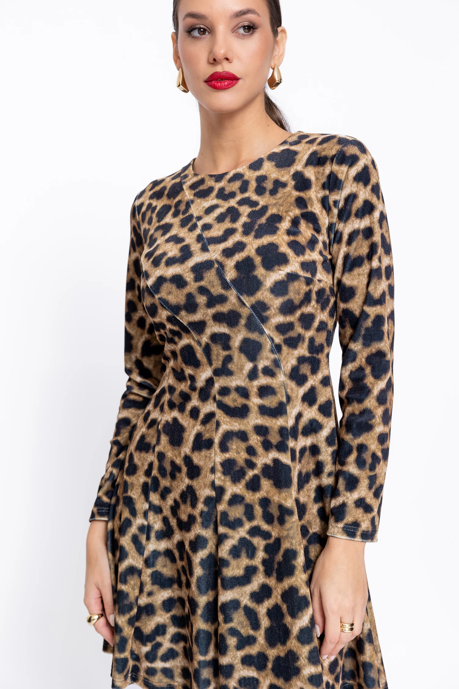 Rochie mini din catifea cu croială evazată, decolteu rotund la baza gâtului și mâneci lungi, decorată cu cusături fine pentru un plus de rafinament. Se închide cu fermoar ascuns la spate și prezintă un imprimeu animal print care adaugă personalitate și stil. O piesă modernă și feminină, ideală pentru evenimente, petreceri sau ieșiri de seară.