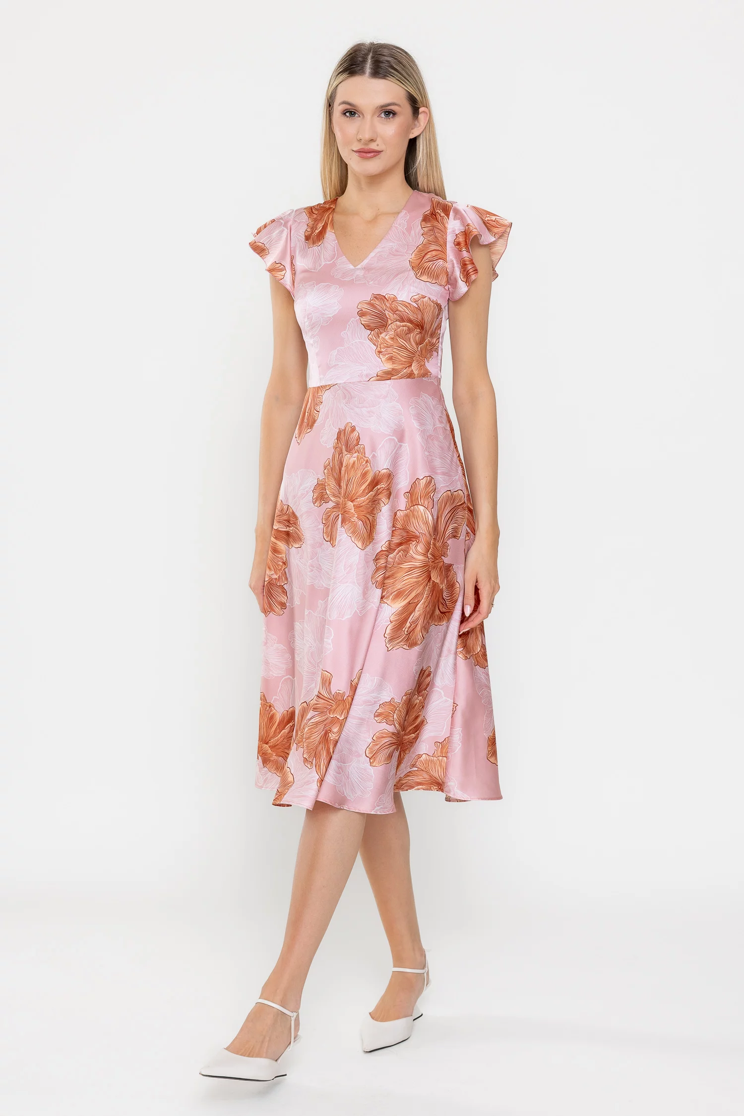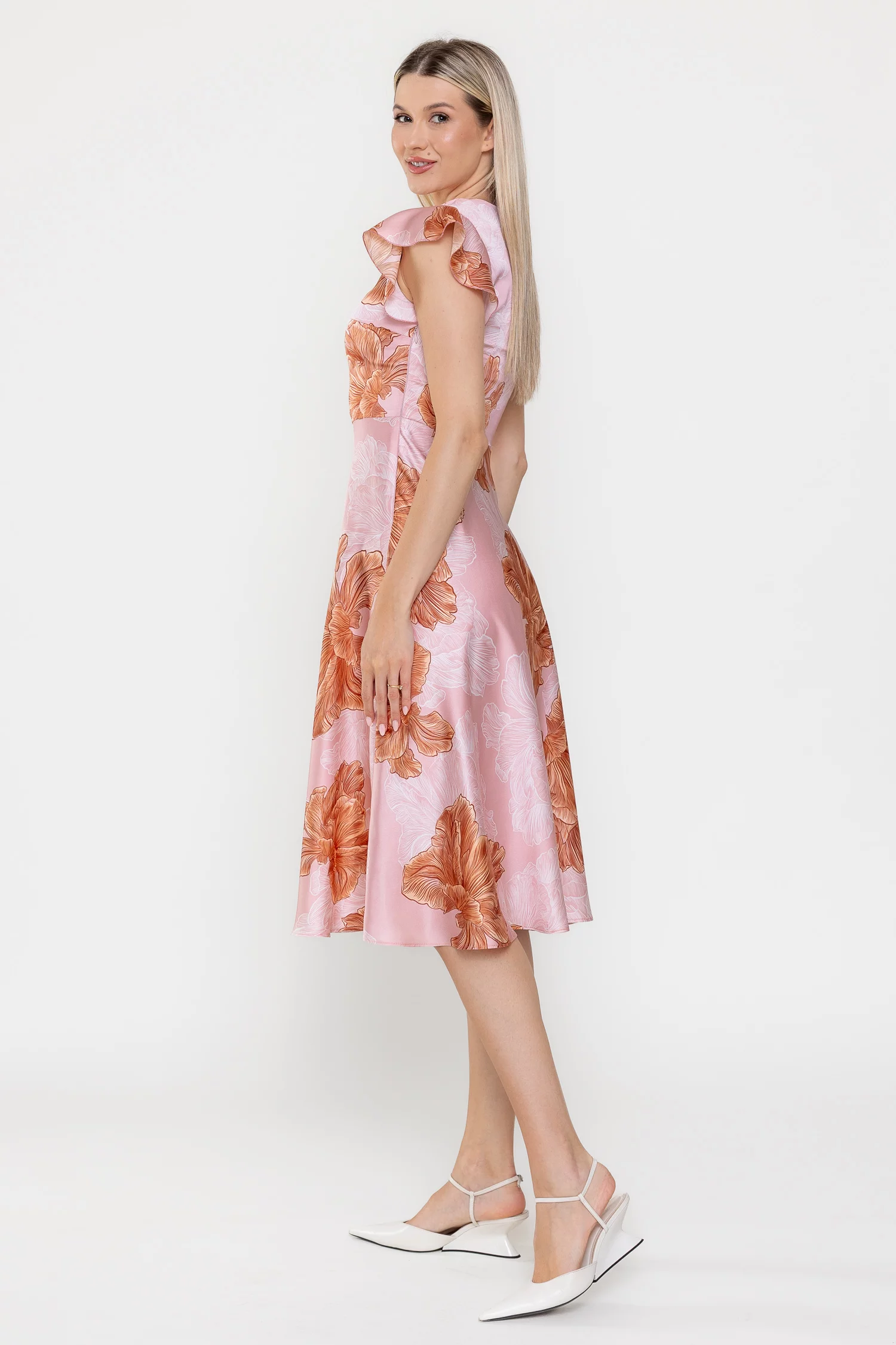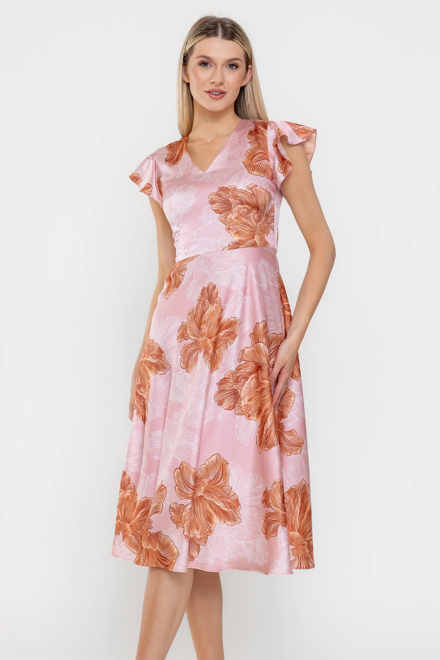 Rochie midi din satin cu un imprimeu floral de impact, perfectă pentru ținute feminine și elegante. Decolteul în V și mânecile scurte decorate cu volan adaugă un plus de romantism, iar talia tăiată subliniază silueta. Fusta midi ușor evazată oferă lejeritate, iar închiderea laterală cu fermoar asigură un plus de confort.