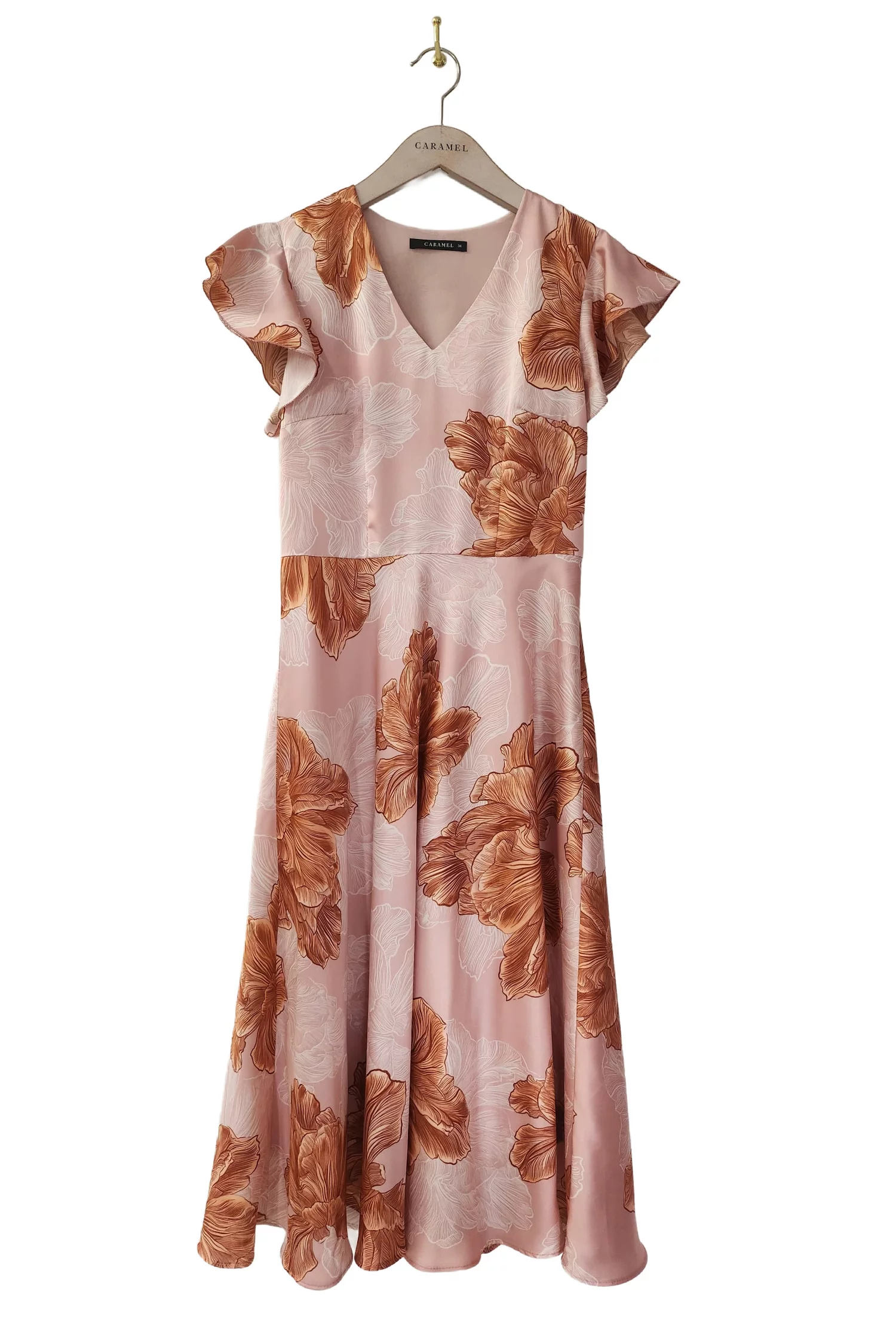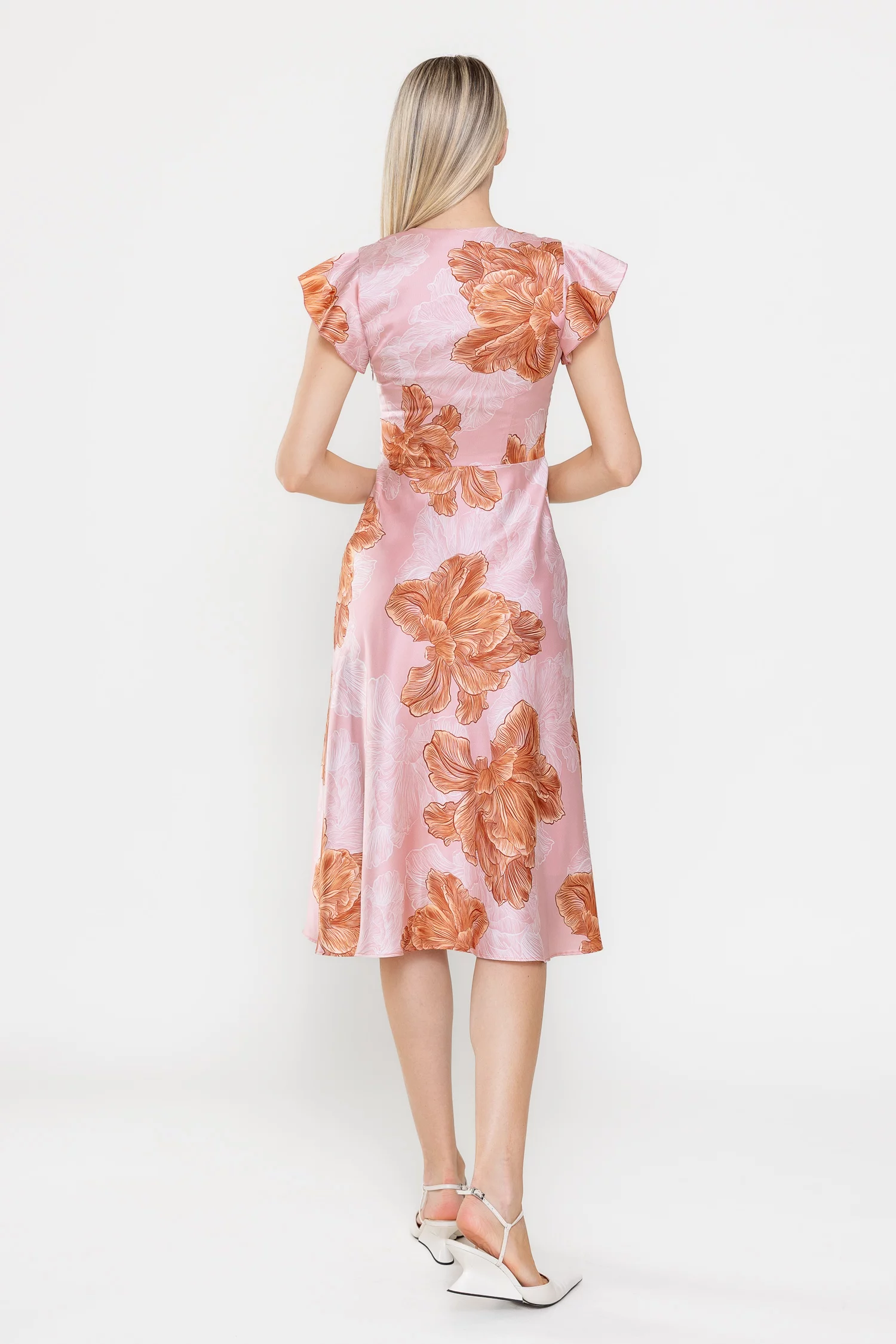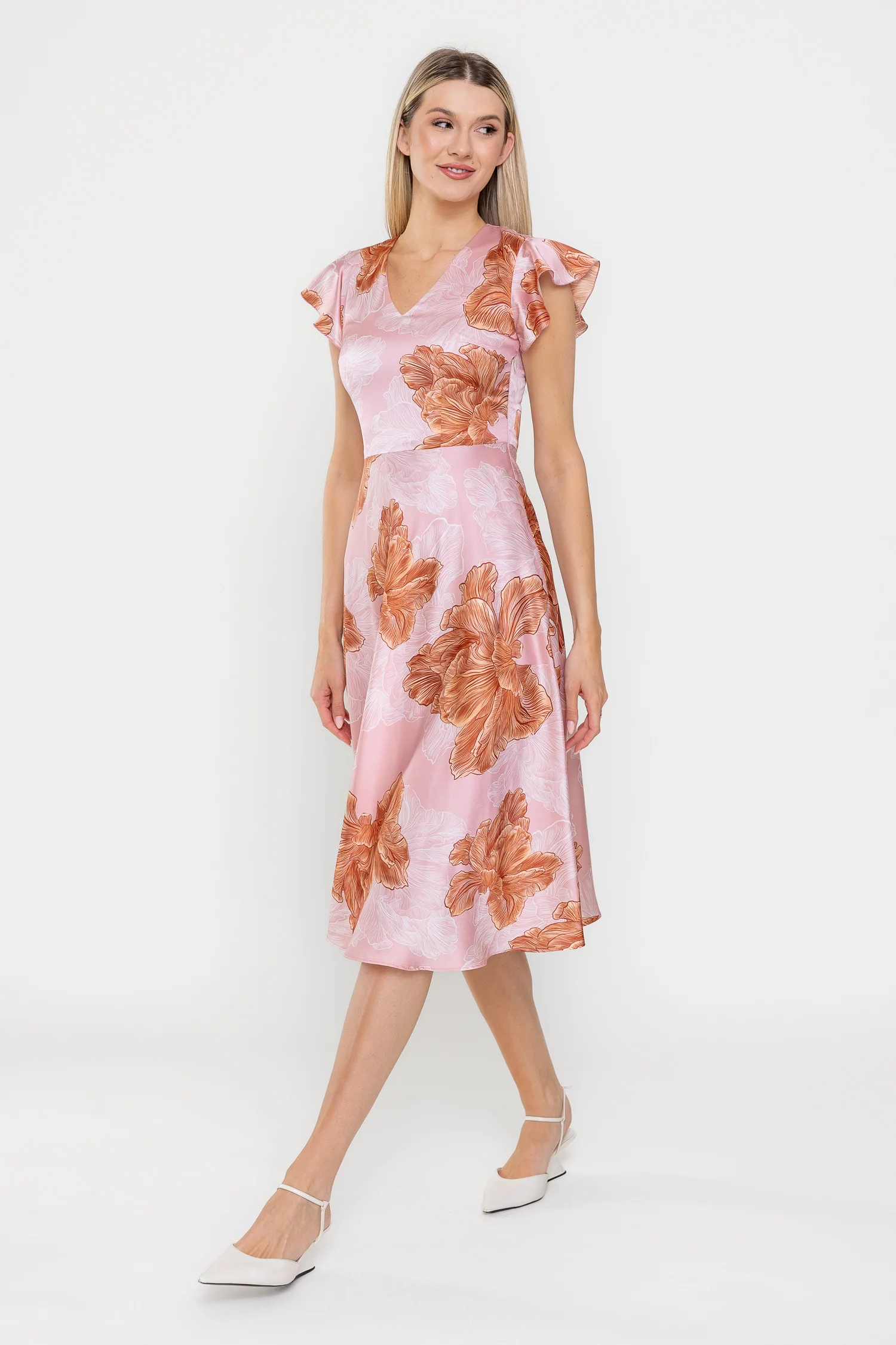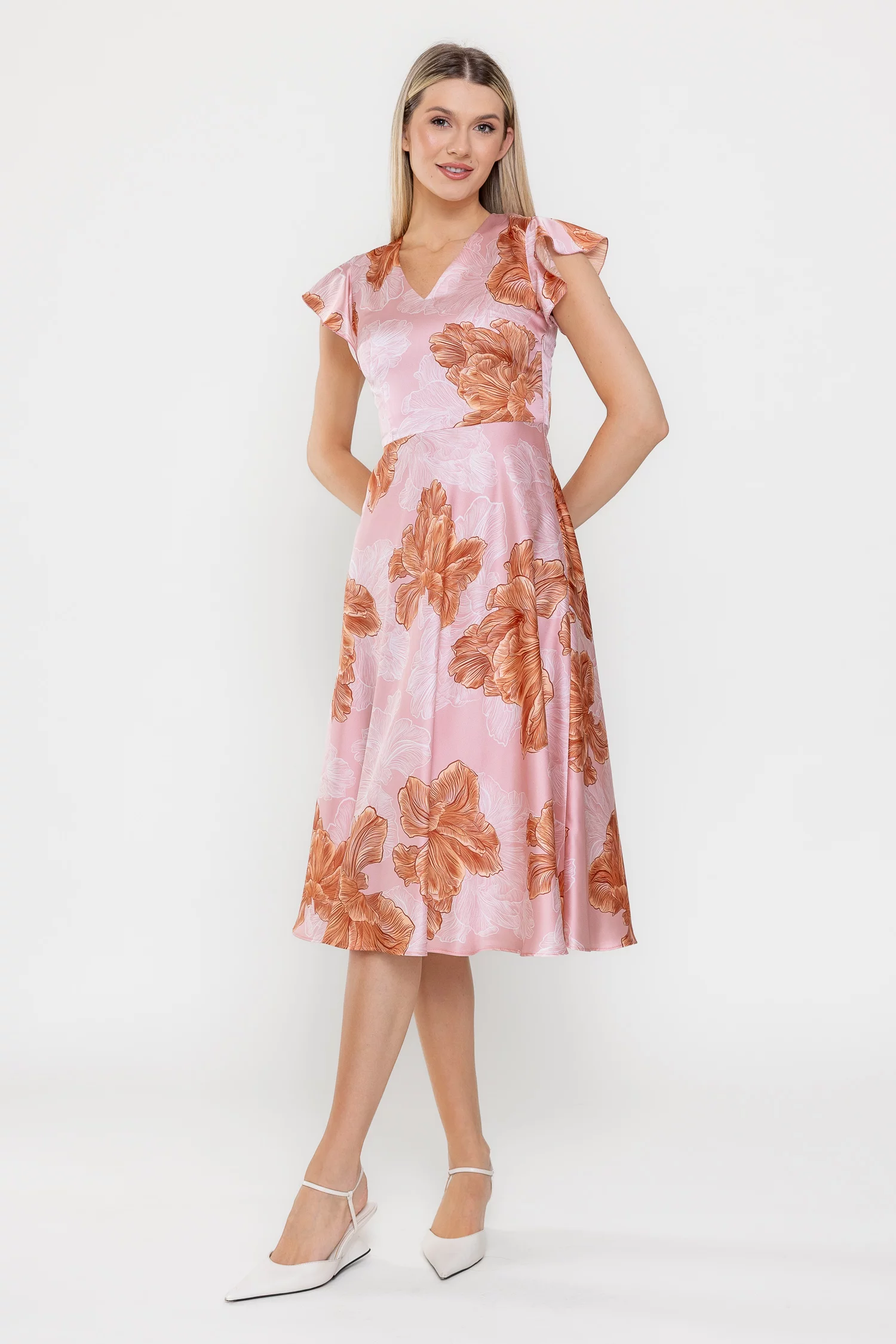 Rochie midi din satin cu un imprimeu floral de impact, perfectă pentru ținute feminine și elegante. Decolteul în V și mânecile scurte decorate cu volan adaugă un plus de romantism, iar talia tăiată subliniază silueta. Fusta midi ușor evazată oferă lejeritate, iar închiderea laterală cu fermoar asigură un plus de confort.