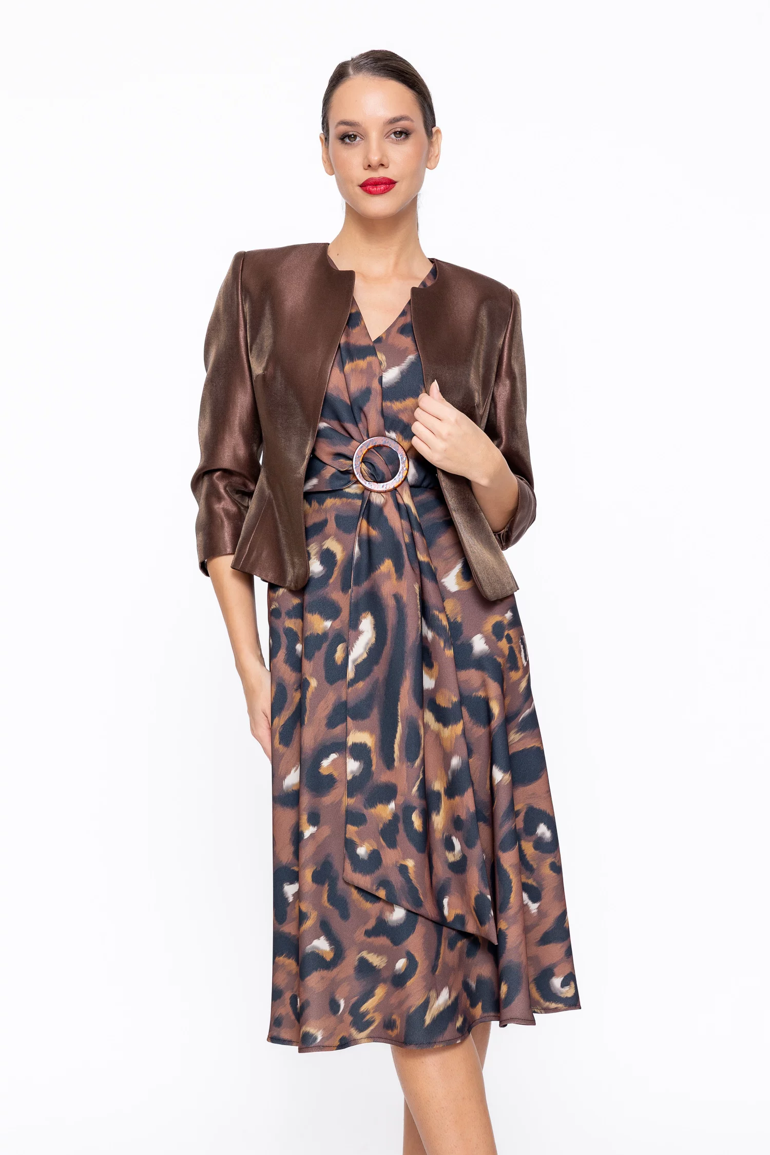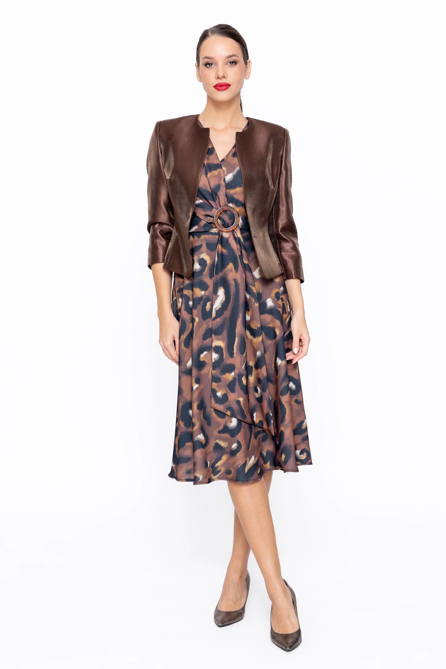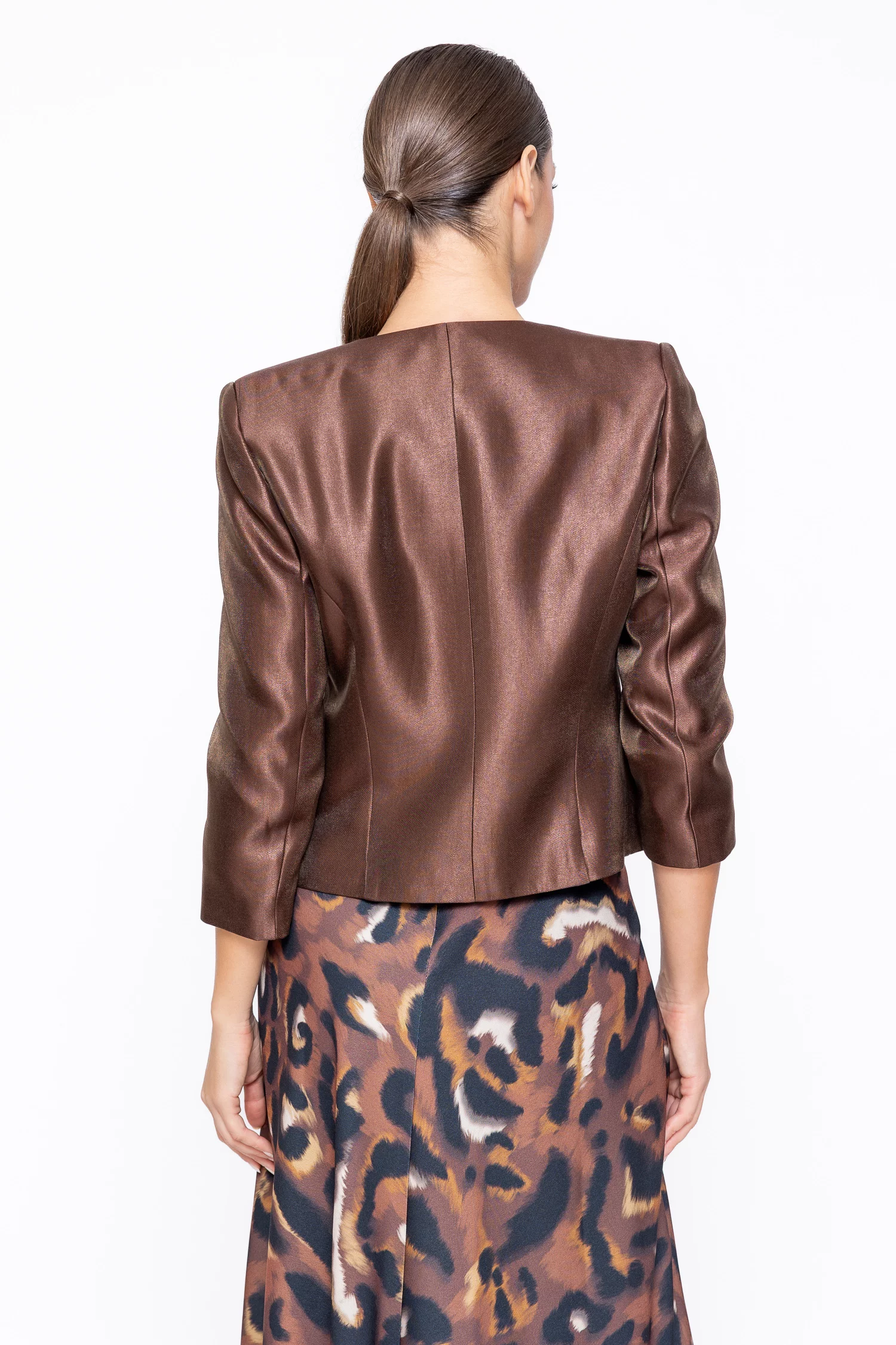Sacou elegant cu o croială dreaptă, ușor cambrată, fără revere, sofisticat și rafinat. Mâneci trei sfert pentru un plus de eleganță, închidere discretă cu moș și babă. Firul lucios subtil adaugă un efect delicat, perfect pentru ținute elegante și evenimente speciale.