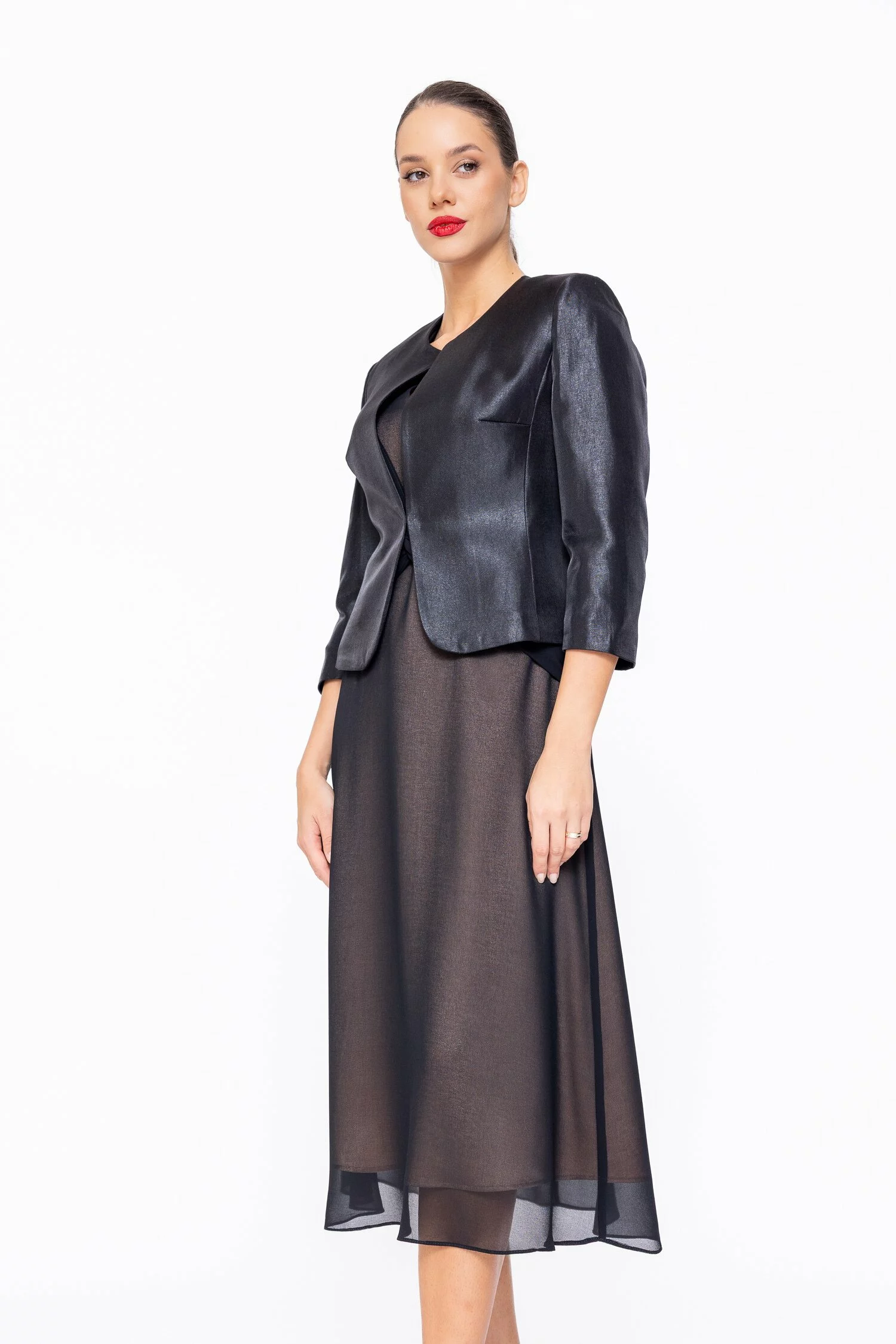 Sacou elegant cu o croială dreaptă, ușor cambrată, fără revere, sofisticat și rafinat. Mâneci trei sfert pentru un plus de eleganță, închidere discretă cu moș și babă. Firul lucios subtil adaugă un efect delicat, perfect pentru ținute elegante și evenimente speciale.