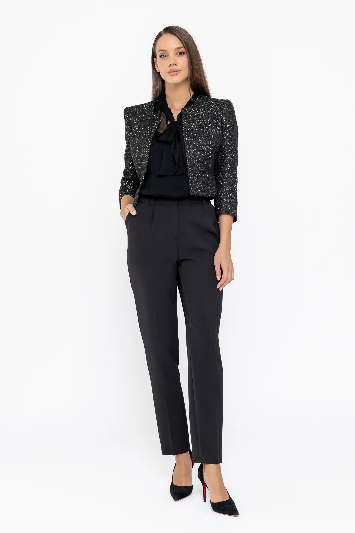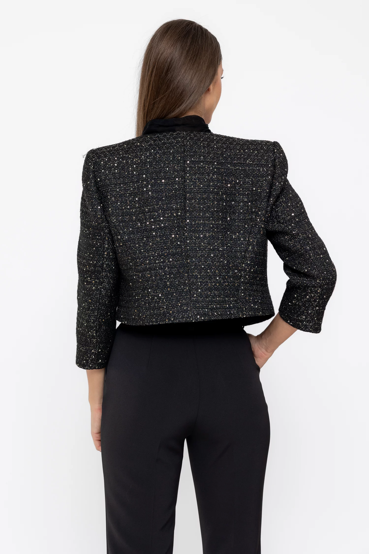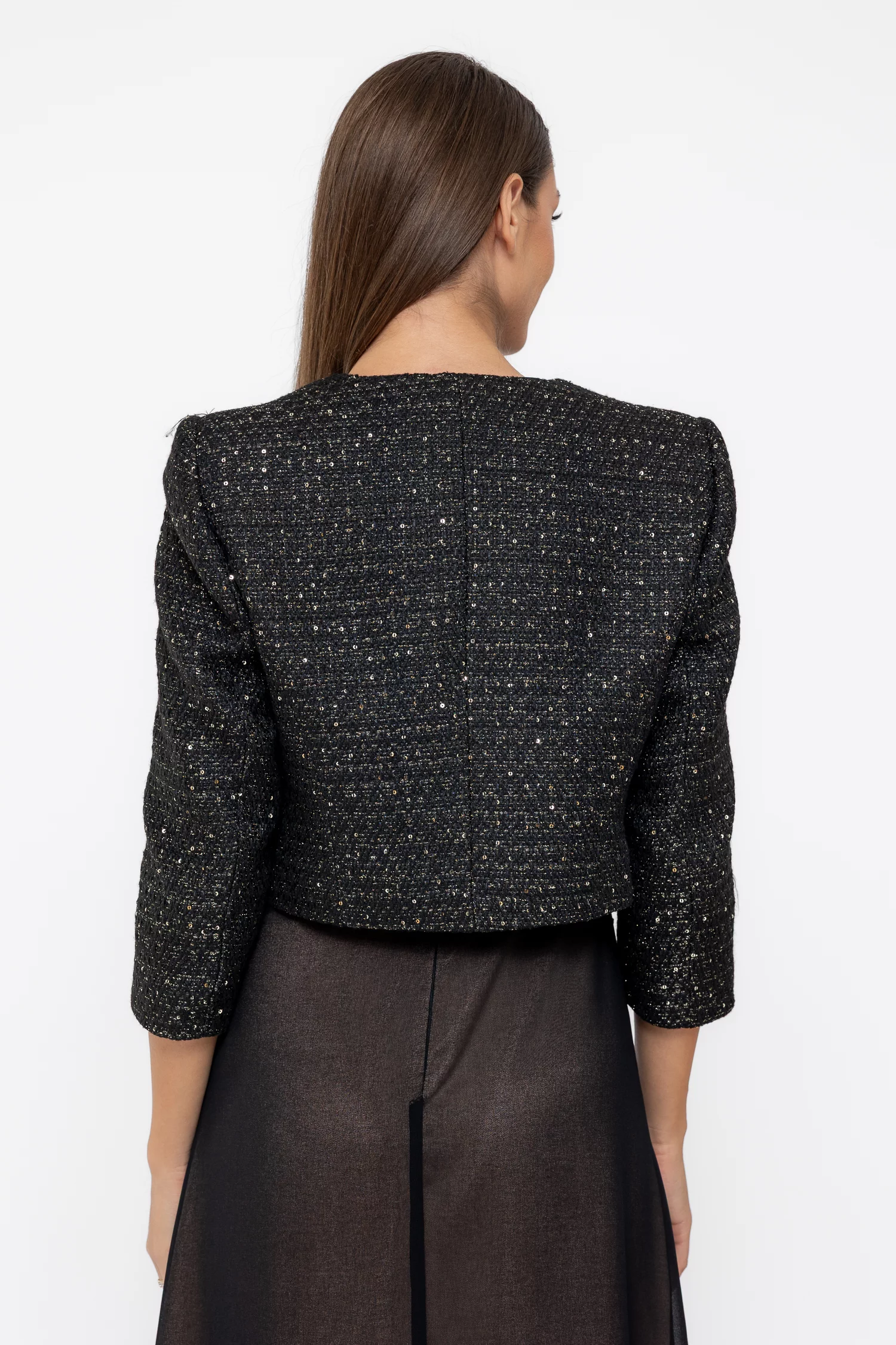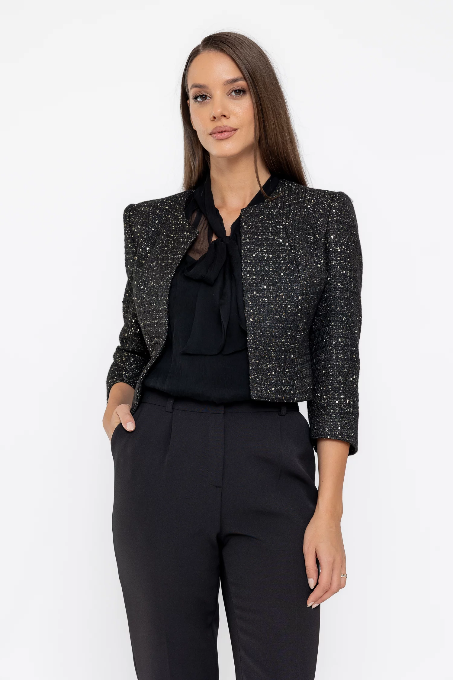 Sacou elegant confecționat din stofă groasă de calitate, cu fir lamé și paiete aurii ce adaugă un plus de rafinament și strălucire. Designul modern, fără revere și cu mâneci lungi, oferă o siluetă feminină și stilată. Se închide discret cu moș și babă, fiind o piesă versatilă, ideală pentru ținute elegante de seară, evenimente speciale sau ocazii festive. Un sacou sofisticat care adaugă un aer prețios oricărei apariții.